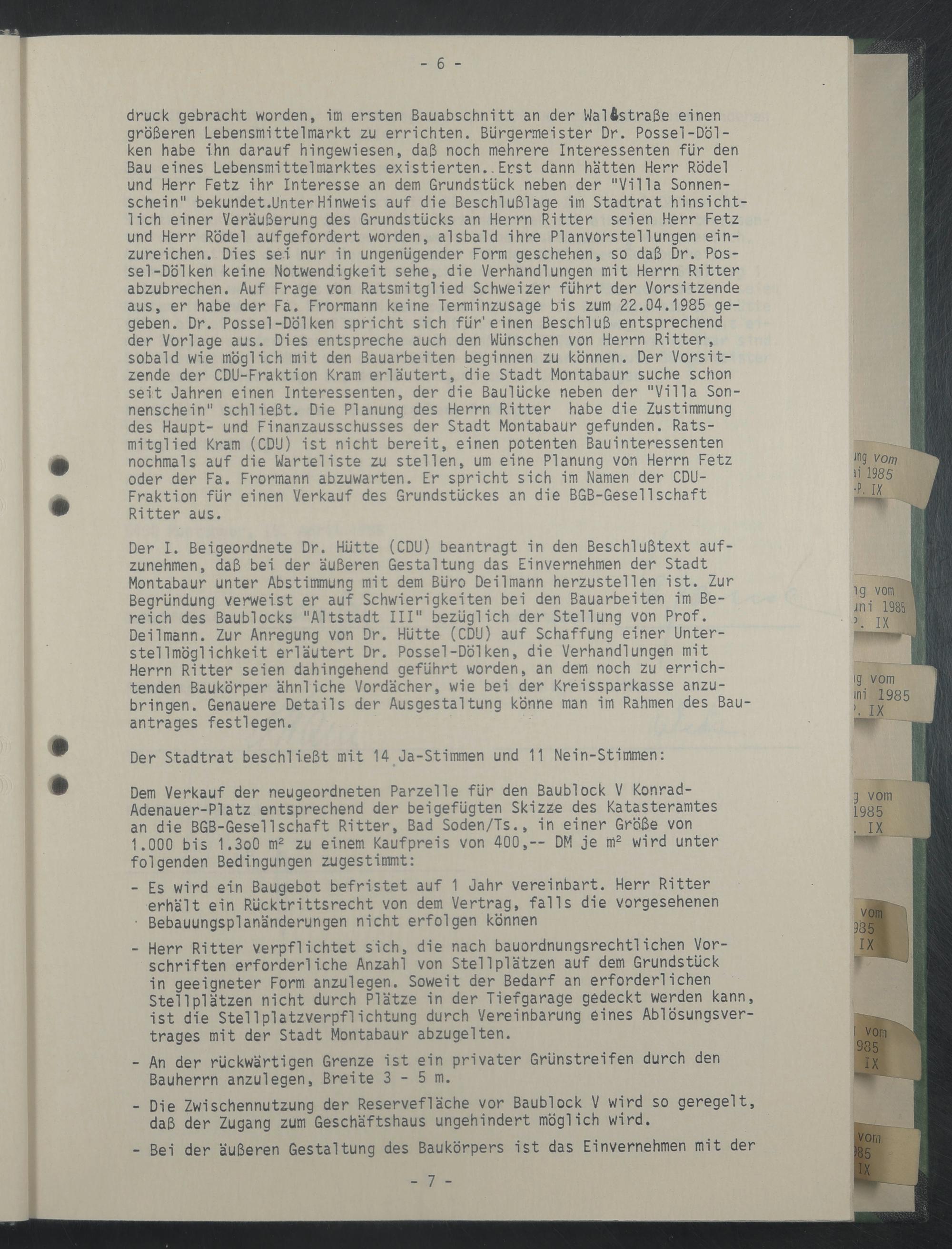 druck gebracht worden, Im ersten Bauabschnitt an der Walzstraße einen größeren Lebensmittelmarkt zu errichten. Bürgermeister Dr. Possei-Döl- ken habe ihn darauf hingewiesen, daß noch mehrere Interessenten für den Bau eines Lebensmittelmarktes existierten..Erst dann hätten Herr Rödel und Herr Fetz ihr Interesse an dem Grundstück neben der "Villa Sonnenschein" bekundet.Unter Hinweis auf die Beschlußlage im Stadtrat hinsichtlich einer Veräußerung des Grundstücks an Herrn Ritter seien Herr Fetz und Herr Rödel aufgefordert worden, alsbald ihre Planvorstellungen einzureichen. Dies sei nur in ungenügender Form geschehen, so daß Dr. Pos- sel-Dölken keine Notwendigkeit sehe, die Verhandlungen mit Herrn Ritter abzubrechen. Auf Frage von Ratsmitglied Schweizer führt der Vorsitzende aus, er habe der Fa. Frormann keine Terminzusage bis zum 22.04.1985 gegeben. Dr. Possel-Dölken spricht sich für'einen Beschluß entsprechend der Vorlage aus. Dies entspreche auch den Wünschen von Herrn Ritter, sobald wie möglich mit den Bauarbeiten beginnen zu können. Der Vorsitzende der CDU-Fraktion Kram erläutert, die Stadt Montabaur suche schon seit Jahren einen Interessenten, der die Baulücke neben der "Villa Sonnenschein" schließt. Die Planung des Herrn Ritter habe die Zustimmung des Haupt- und Finanzausschusses der Stadt Montabaur gefunden. Ratsmitglied Kram (CDU) ist nicht bereit, einen potenten Bauinteressenten nochmals auf die Warteliste zu stellen, um eine Planung von Herrn Fetz oder der Fa. Frormann abzuwarten. Er spricht sich im Namen der CDU- Fraktion für einen Verkauf des Grundstückes an die BGB-Gesellschaft Ritter aus.