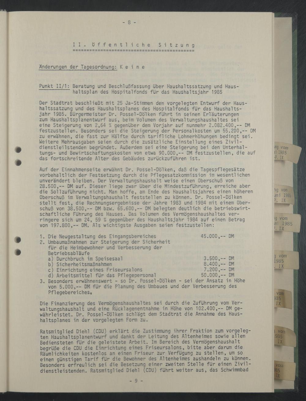 Der Stadtrat beschließt mit 25 Ja-Stimmen den vorgelegten Entwurf der Haushaltssatzung und des Haushaltsplanes des Hospitalfonds für das Haushaltsjahr 1985. Bürgermeister Dr. Posse!-Dölken führt in seinen Erläuterungen zum Haushaltsplanentwurf aus, beim Volumen des Verwaltungshaushaltes sei eine Steigerung von 2,64 % gegenüber dem Vorjahr auf nunmehr 2.082.400,-- DM festzustellen. Besonders sei die Steigerung der Personal kosten um 55.200,-- DM zu erwähnen, die fast zur Hälfte durch tarifliche Lohnerhöhungen bedingt sei. Weitere Mehrausgaben seien durch die zusätzliche Einstellung eines Zivil- dienstleilstenden begründet. Außerdem sei eine Steigerung bei den Unterhaltung^- und Bewirtschaftungskosten von etwa 90.000,-- DM festzustellen, die auf das fortschreitende Alter des Gebäudes zurückzuführen ist.