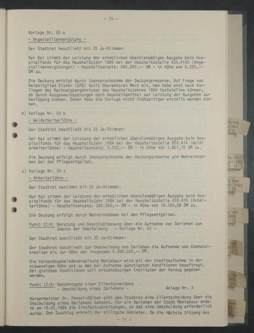 Bürgermeister Dr. Possel-Dölken gibt dem Stadtrat eine Eilentscheidung über die Umschuldung eines Darlehens bekannt. Für ein Darlehen der Stadt Montabaur endete am 19.02.1985 die Zinsfestschreibungen, so daß eine Umschuldung erforderlich