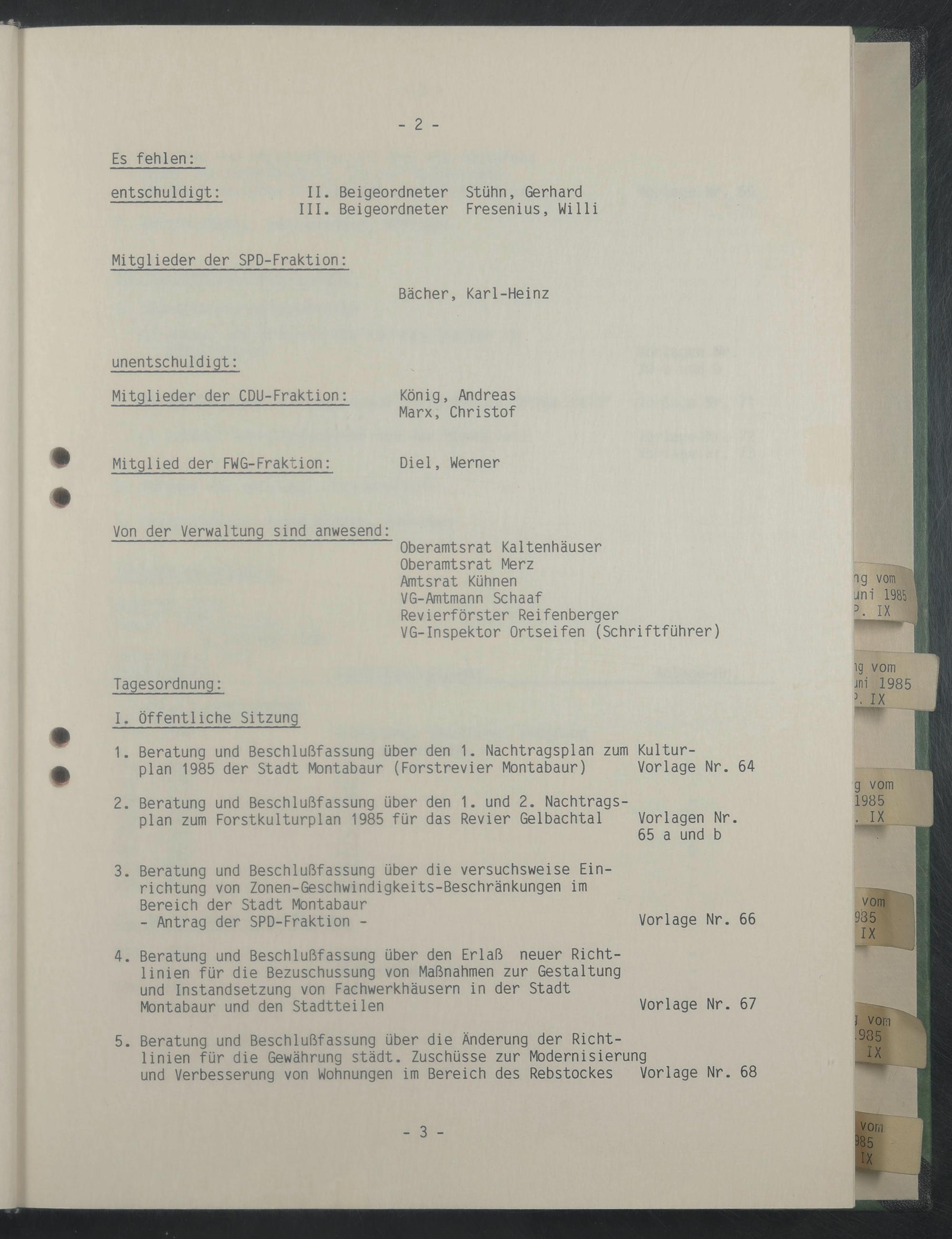 2. Beratung und Beschlußfassung über den 1. und 2. Nachtragsplan zum Forstkulturplan 1985 für das Revier Gelbachtal Vorlagen Nr.