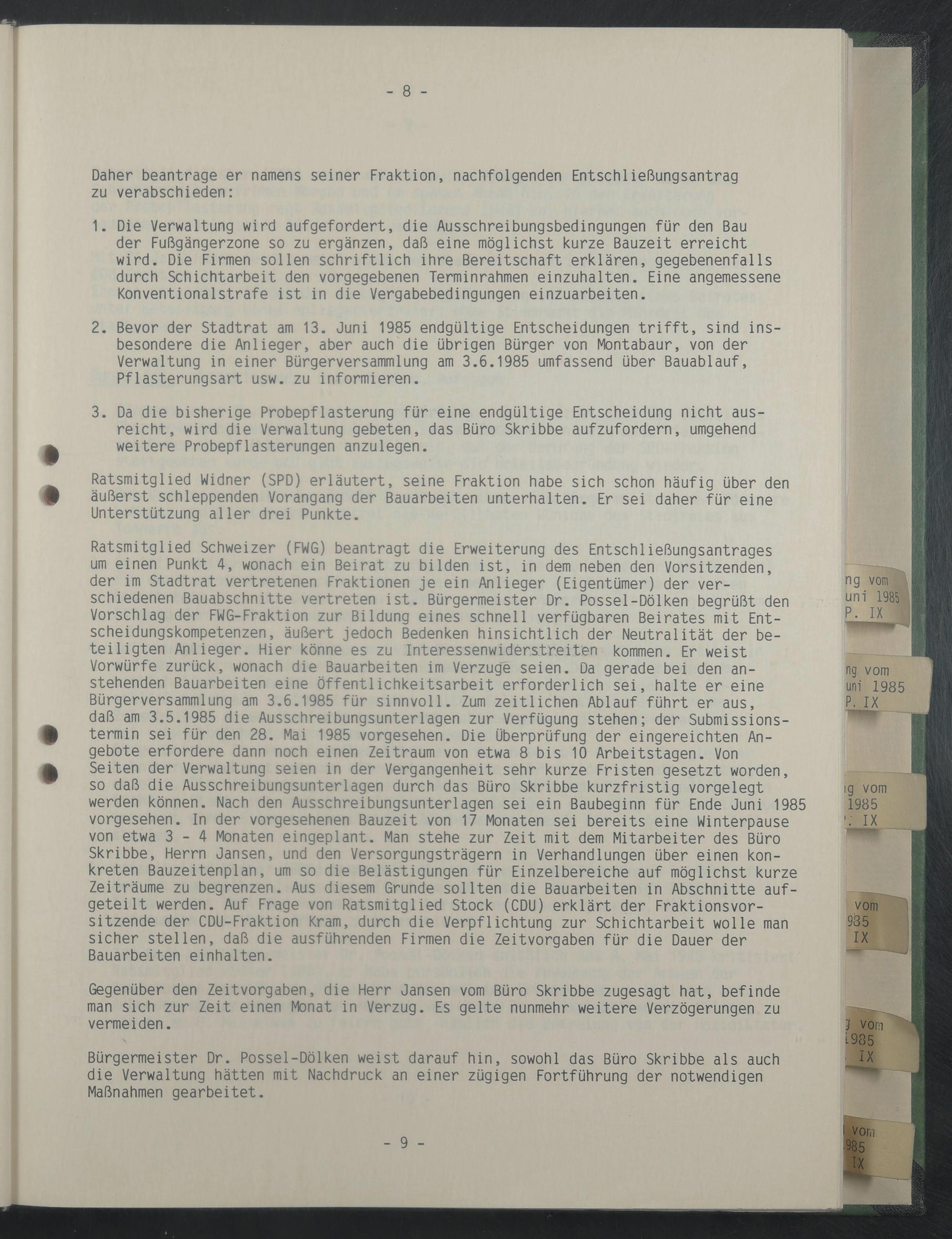 Ratsmitglied Schweizer (FWG) beantragt die Erweiterung des Entschließungsantrages um einen Punkt 4, wonach ein Beirat zu bilden ist, in dem neben den Vorsitzenden, der im Stadtrat vertretenen Fraktionen je ein Anlieger (Eigentümer) der verschiedenen Bauabschnitte vertreten ist. Bürgermeister Dr. Possel-Dölken begrüßt den Vorschlag der FWG-Fraktion zur Bildung eines schnell verfügbaren Beirates mit Entscheidungskompetenzen, äußert jedoch Bedenken hinsichtlich der Neutralität der beteiligten Anlieger. Hier könne es zu Interessenwiderstreiten kommen. Er weist Vorwürfe zurück, wonach die Bauarbeiten im Verzüge seien. Da gerade bei den anstehenden Bauarbeiten eine Öffentlichkeitsarbeit erforderlich sei, halte er eine Bürgerversammlung am 3.6.1985 für sinnvoll. Zum zeitlichen Ablauf führt er aus, daß am 3.5.1985 die Ausschreibungsunterlagen zur Verfügung stehen; der Submissionstermin sei für den 28. Mai 1985 vorgesehen. Die Überprüfung der eingereichten Angebote erfordere dann noch einen Zeitraum von etwa 8 bis 10 Arbeitstagen. Von Seiten der Verwaltung seien in der Vergangenheit sehr kurze Fristen gesetzt worden, so daß die Ausschreibungsunterlagen durch das Büro Skribbe kurzfristig vorgelegt werden können. Nach den Ausschreibungsunterlagen sei ein Baubeginn für Ende Juni 1985 vorgesehen. In der vorgesehenen Bauzeit von 17 Monaten sei bereits eine Winterpause von etwa 3 - 4 Monaten eingeplant. Man stehe zur Zeit mit dem Mitarbeiter des Büro Skribbe, Herrn Jansen, und den Versorgungsträgern in Verhandlungen über einen konkreten Bauzeitenplan, um so die Belästigungen für Einzelbereiche auf möglichst kurze Zeiträume zu begrenzen. Aus diesem Grunde sollten die Bauarbeiten in Abschnitte aufgeteilt werden. Auf Frage von Ratsmitglied Stock (CDU) erklärt der Fraktionsvorsitzende der CDU-Fraktion Kram, durch die Verpflichtung zur Schichtarbeit wolle man sicher stellen, daß die ausführenden Firmen die Zeitvorgaben für die Dauer der Bauarbeiten einhalten.