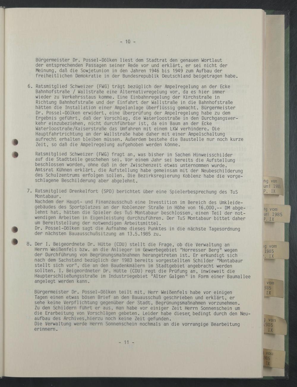 Bürgermeister Dr. Possel-Dölken liest dem Stadtrat den genauen Wortlaut der entsprechenden Passagen seiner Rede vor und erklärt, er sei nicht der Meinung, daß die Sowjetunion in den Jahren 1946 bis 1949 zum Aufbau der freiheitlichen Demokratie in der Bundesrepublik Deutschland beigetragen habe.