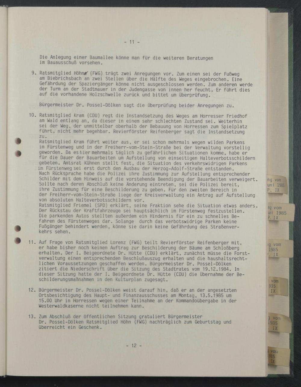 12. Bürgermeister Dr. Possel-Dölken weist darauf hin, daß er an der angesetzten Ortsbesichtigung des Haupt- und Finanzausschusses am Montag, 13.5.1985 um 15.00 Uhr in Horressen wegen einer Teilnahme an der Kommandoübergabe in der Westerwaldkaserne nicht teilnehmen kann.