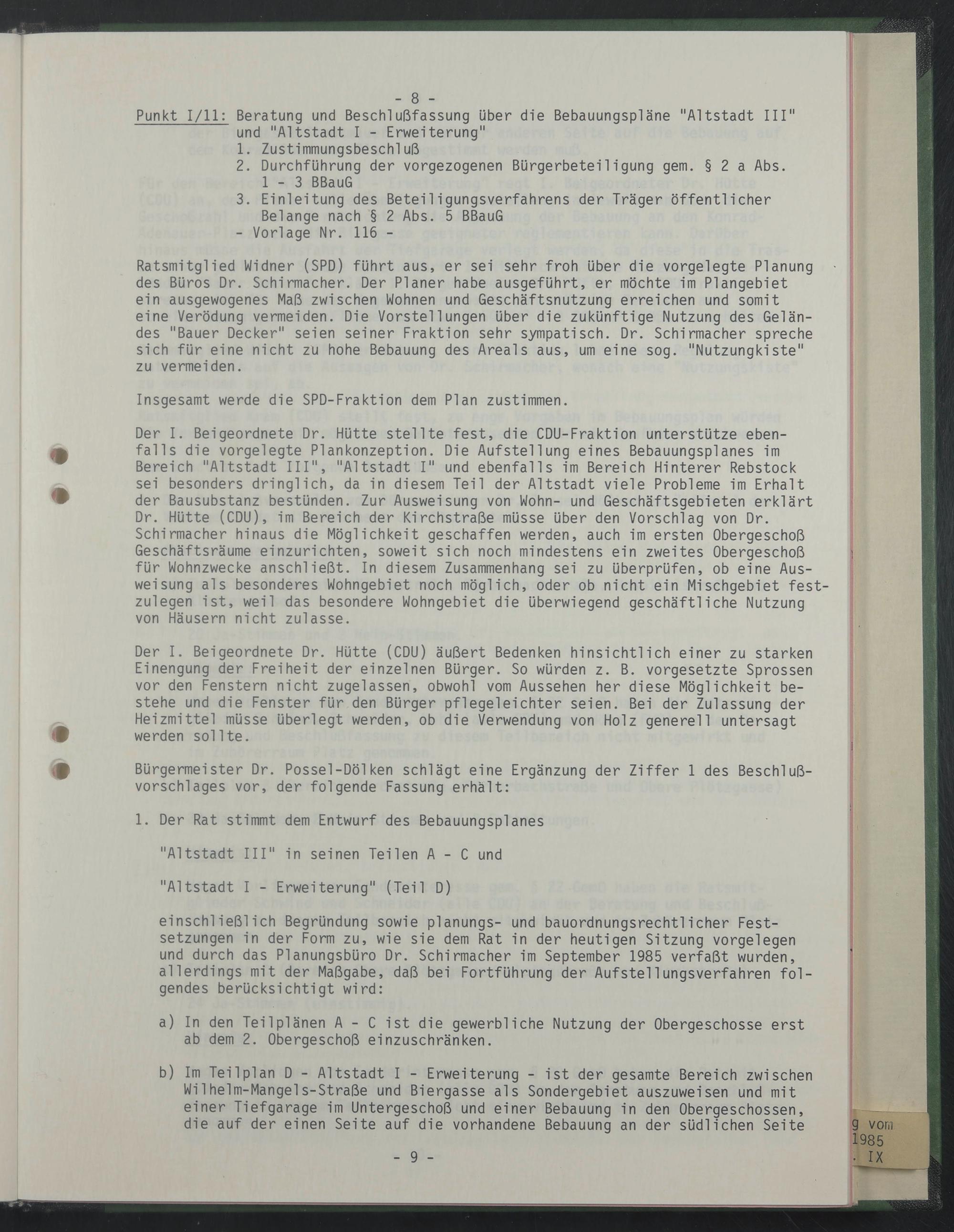 Der I. Beigeordnete Dr. Hütte stellte fest, die CDU-Fraktion unterstütze ebenfalls die vorgelegte Plankonzeption. Die Aufstellung eines Bebauungsplanes im Bereich "Altstadt III", "Altstadt I" und ebenfalls im Bereich Hinterer Rebstock sei besonders dringlich, da in diesem Teil der Altstadt viele Probleme im Erhalt der Bausubstanz bestünden. Zur Ausweisung von Wohn- und Geschäftsgebieten erklärt Dr. Hütte (CDU), im Bereich der Kirchstraße müsse über den Vorschlag von Dr. Schirmacher hinaus die Möglichkeit geschaffen werden, auch im ersten Obergeschoß Geschäftsräume einzurichten, soweit sich noch mindestens ein zweites Obergeschoß für Wohnzwecke anschließt. In diesem Zusammenhang sei zu überprüfen, ob eine Ausweisung als besonderes Wohngebiet noch möglich, oder ob nicht ein Mischgebiet festzulegen ist, weil das besondere Wohngebiet die überwiegend geschäftliche Nutzung von Häusern nicht zulasse.