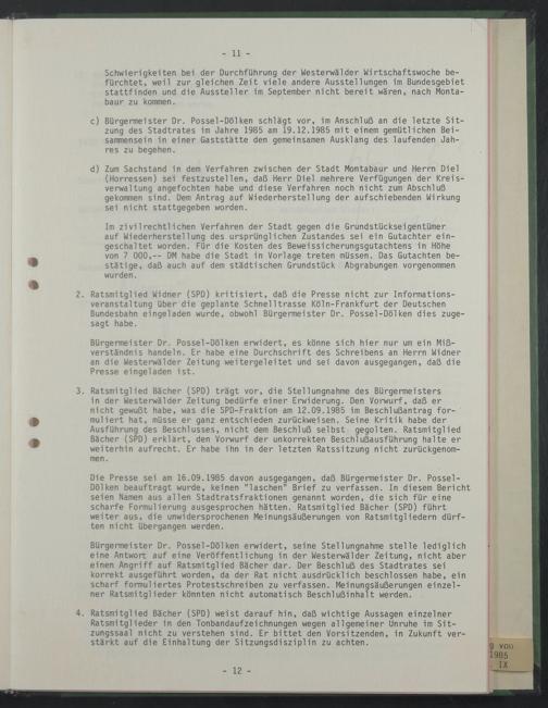 Bürgermeister Dr. Possel-Dölken erwidert, seine Stellungnahme stelle lediglich eine Antwort auf eine Veröffentlichung in der Westerwälder Zeitung, nicht aber einen Angriff auf Ratsmitglied Bächer dar. Der Beschluß des Stadtrates sei korrekt ausgeführt worden, da der Rat nicht ausdrücklich beschlossen habe, ein scharf formuliertes Protestschreiben zu verfassen. Meinungsäußerungen einzelner Ratsmitglieder könnten nicht automatisch Beschlußinhalt werden.