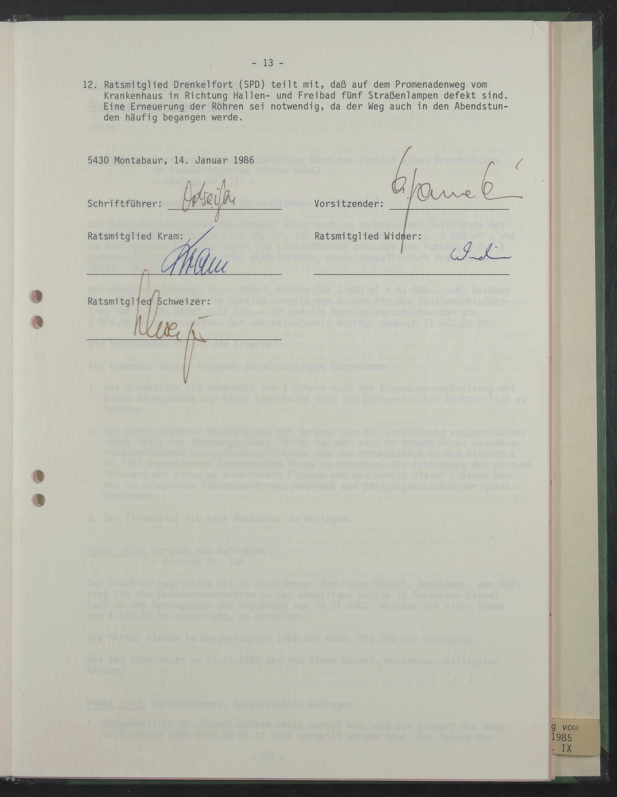 12. Ratsmitglied Drenkelfort (SPD) teilt mit, daß auf dem Promenadenweg vom Krankenhaus in Richtung Hallen- und Freibad fünf Straßenlampen defekt sind. Eine Erneuerung der Röhren sei notwendig, da der Weg auch in den Abendstunden häufig begangen werde.