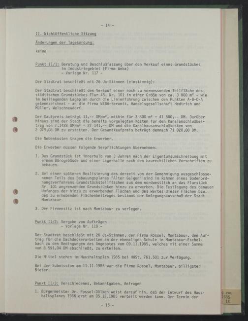 Punkt 11/1: Beratung und Beschlußfassung über den Verkauf eines Grundstückes im Industriegebiet (Firma Weba)