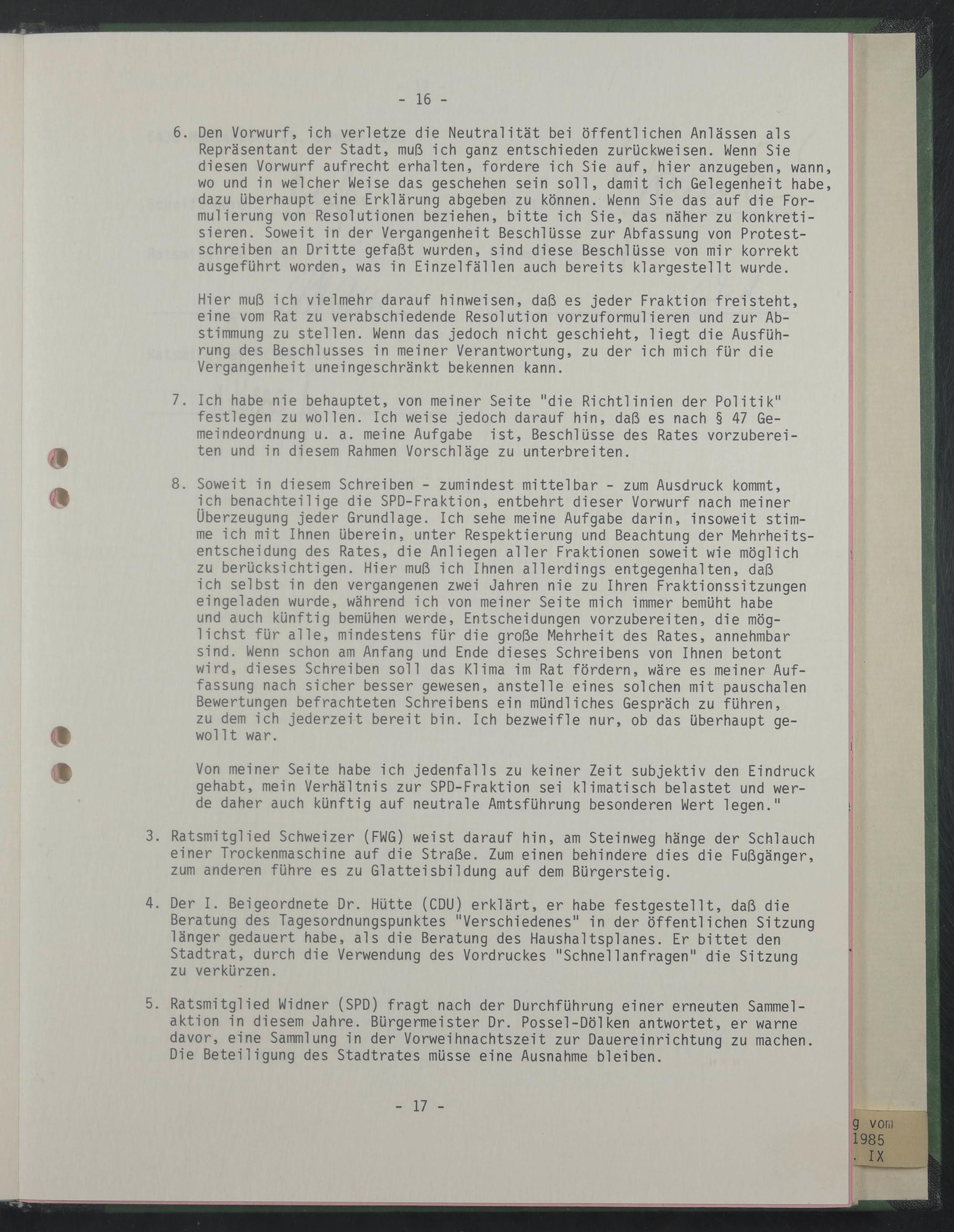 6. Den Vorwurf, ich verletze die Neutralität bei öffentlichen Anlässen als Repräsentant der Stadt, muß ich ganz entschieden zurückweisen. Wenn Sie diesen Vorwurf aufrecht erhalten, fordere ich Sie auf, hier anzugeben, wann, wo und in welcher Weise das geschehen sein soll, damit ich Gelegenheit habe, dazu überhaupt eine Erklärung abgeben zu können. Wenn Sie das auf die Formulierung von Resolutionen beziehen, bitte ich Sie, das näher zu konkretisieren. Soweit in der Vergangenheit Beschlüsse zur Abfassung von Protestschreiben an Dritte gefaßt wurden, sind diese Beschlüsse von mir korrekt ausgeführt worden, was in Einzelfällen auch bereits klargestellt wurde.