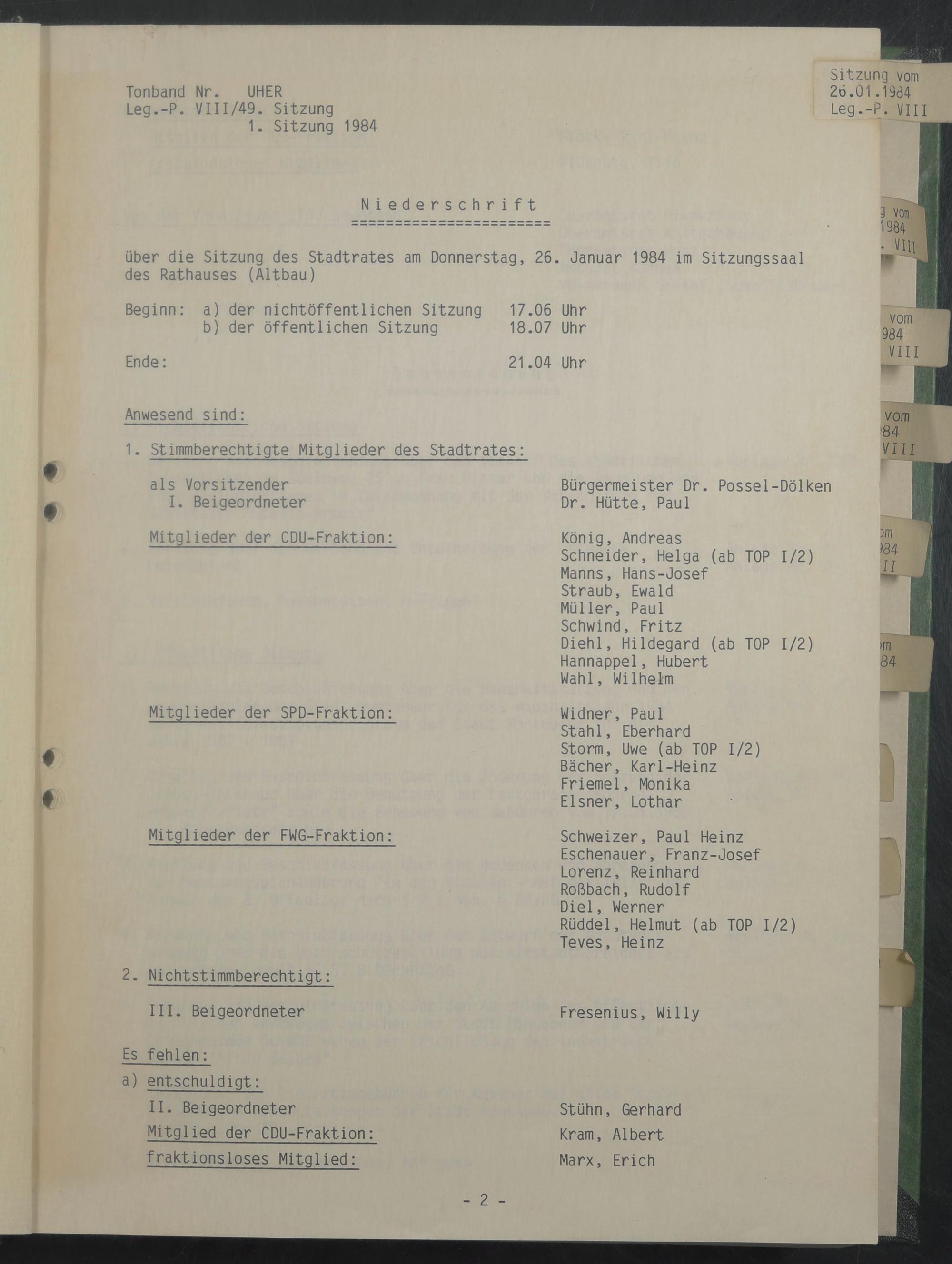 über die Sitzung des Stadtrates am Donnerstag, 26. Januar 1984 im Sitzungssaal des Rathauses (Altbau)