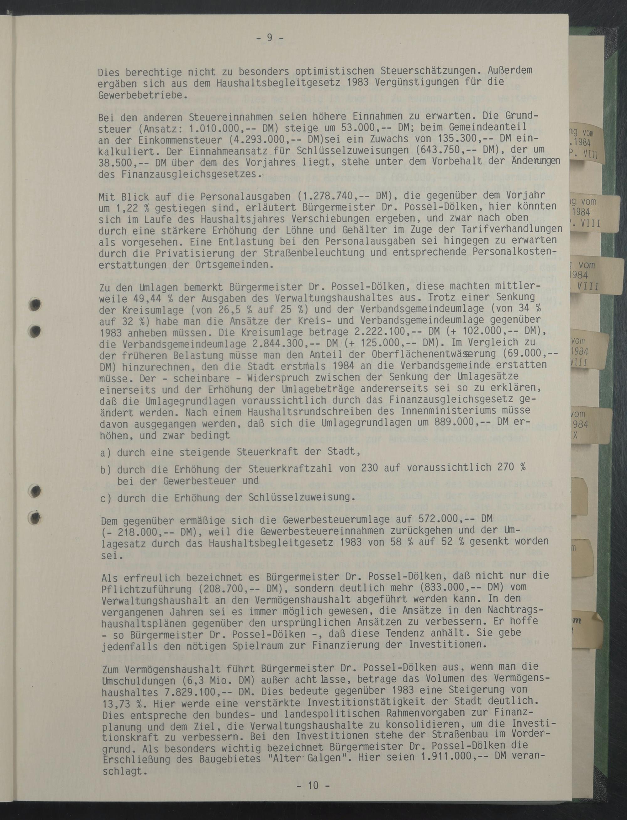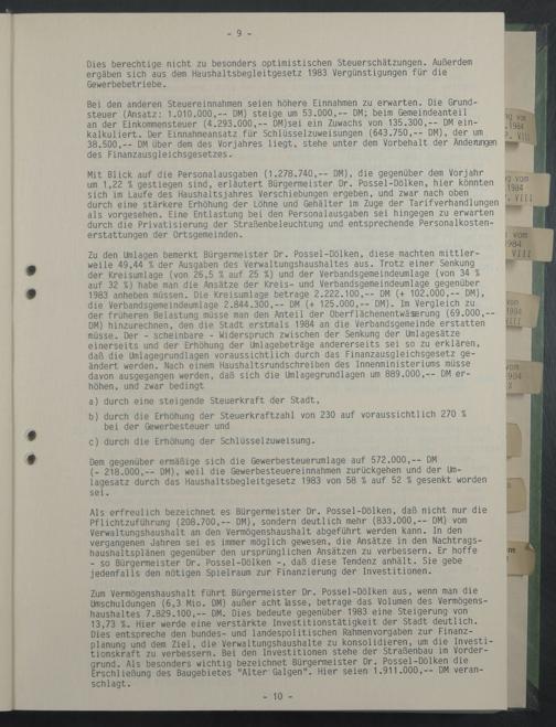 Zum Vermögenshaushalt führt Bürgermeister Dr. Possei-Dölken aus, wenn man die Umschuldungen (6,3 Mio. DM) außer acht lasse, betrage das Volumen des Vermögenshaushaltes 7.829.100,-- DM. Dies bedeute gegenüber 1983 eine Steigerung von 13,73 %. Hier werde eine verstärkte Investitionstätigkeit der Stadt deutlich.