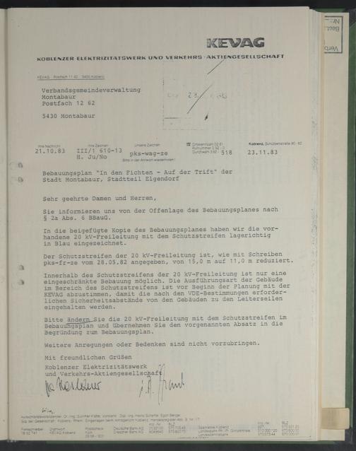 Innerhalb des Schutzstreifens der 20 kV-Freileitung ist nur eine eingeschränkte Bebauung möglich. Die Ausführungsart der Gebäude im Bereich des Schutzstreifens ist vor Beginn der Planung mit der KEVAG abzustimmen, damit die nach den VDE-Bestimmungen erforderlichen Sicherheitsabstände von den Gebäuden zu den Leiterseilen eingehalten werden.