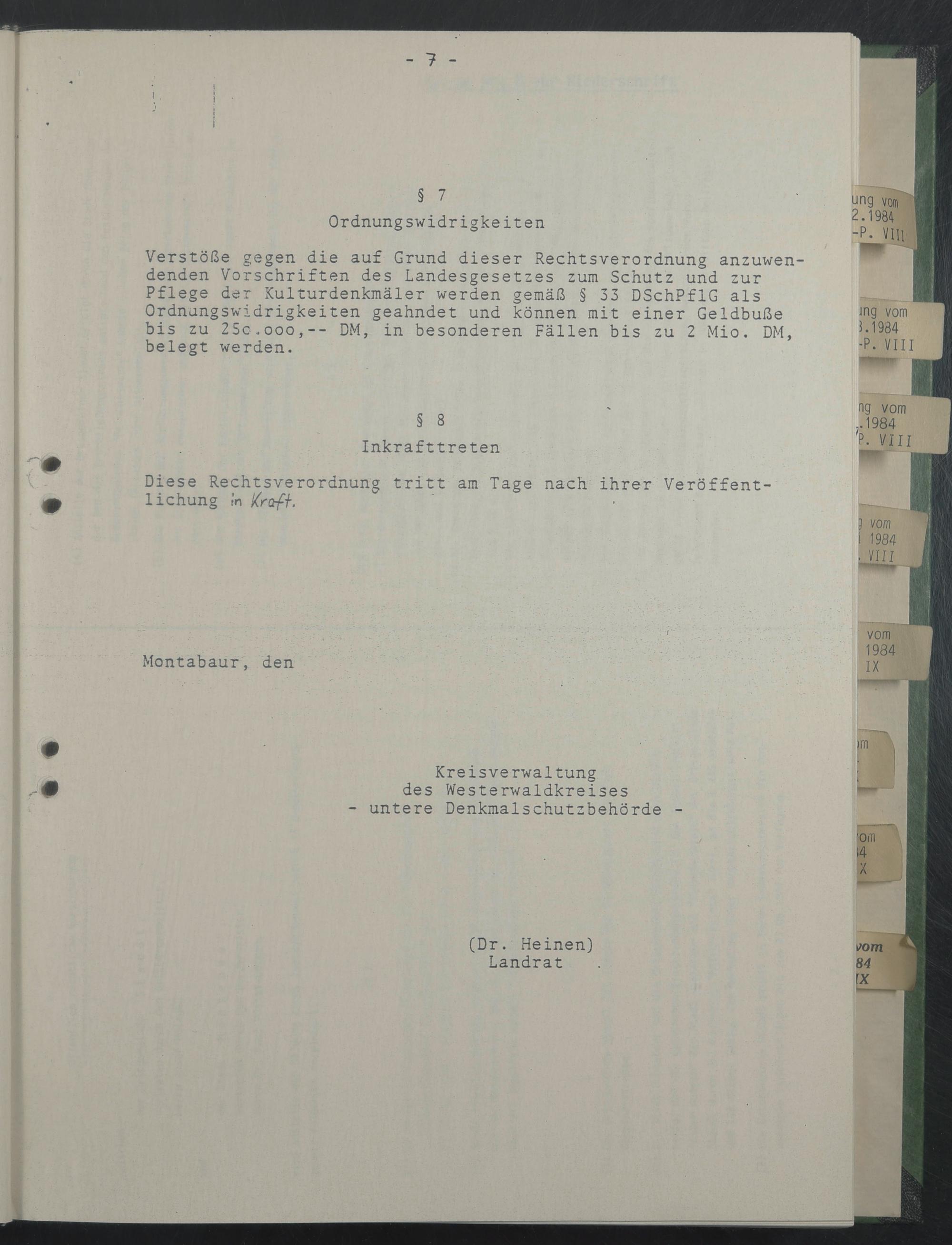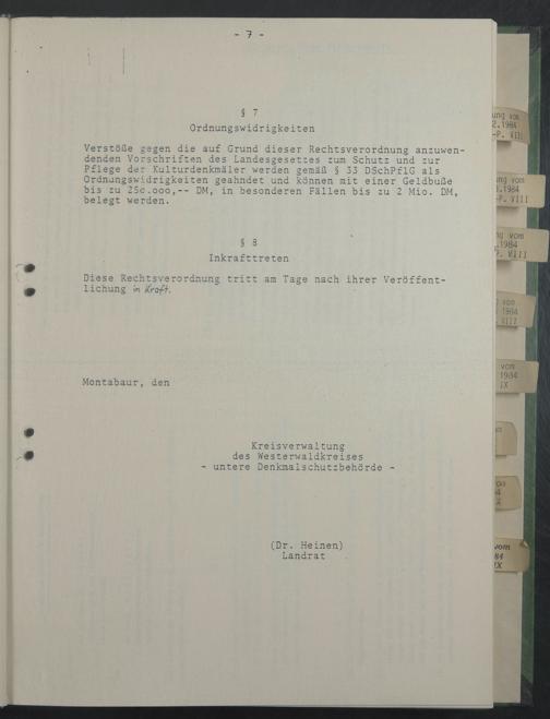 Verstöße gegen die auf Grund dieser Rechtsverordnung anzuwendenden Vorschriften des Landesgesetzes zum Schutz und zur Pflege der Kulturdenkmäler werden gemäß § 33 DSchPflG als Ordnungswidrigkeiten geahndet und können mit einer Geldbuße bis zu 25c.ooo,-- DM, in besonderen Fällen bis zu 2 Mio. DM, belegt werden.