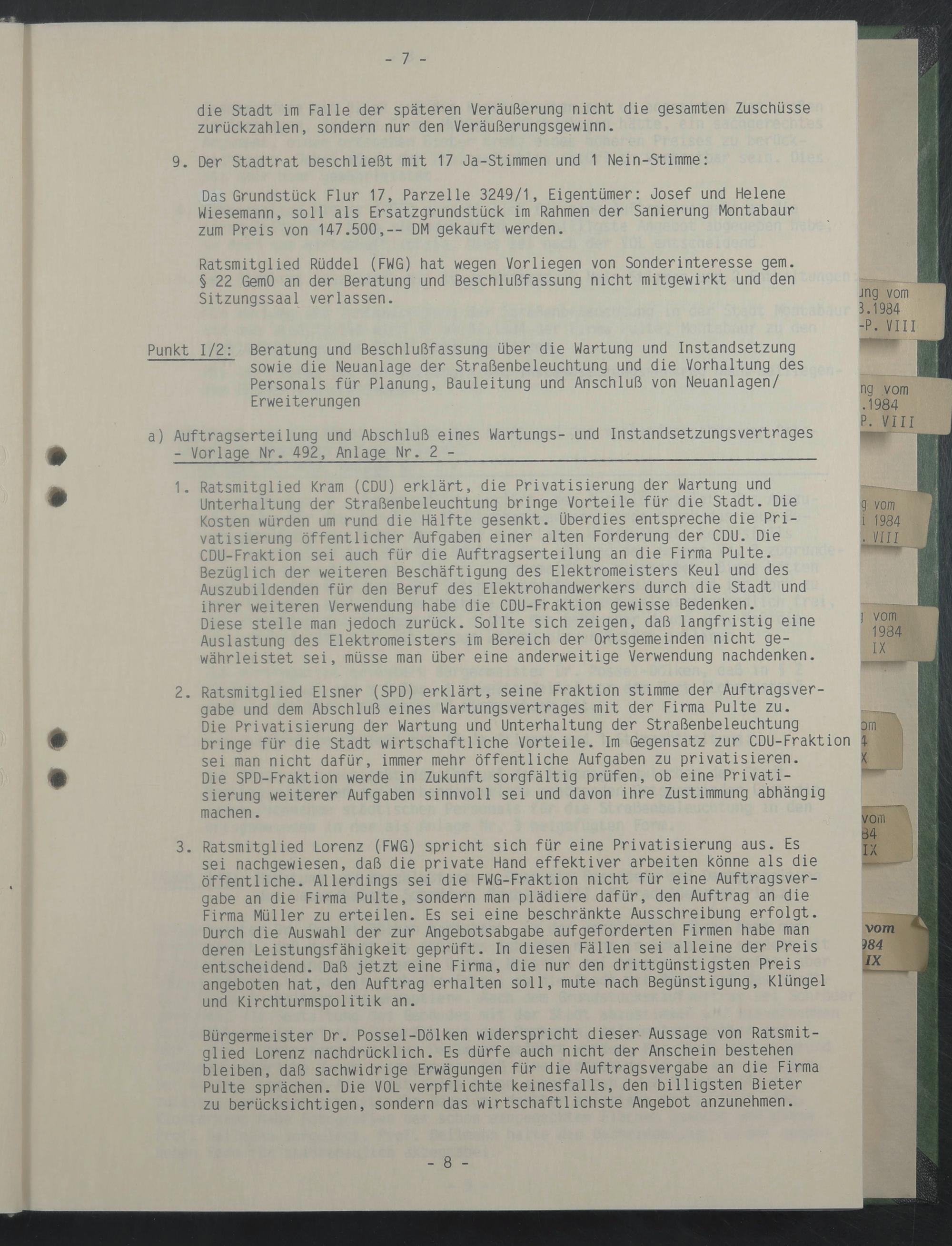 Bürgermeister Dr. Possel-Dölken widerspricht dieser Aussage von Ratsmitglied Lorenz nachdrücklich. Es dürfe auch nicht der Anschein bestehen bleiben, daß sachwidrige Erwägungen für die Auftragsvergabe an die Firma Pulte sprächen. Die VOL verpflichte keinesfalls, den billigsten Bieter zu berücksichtigen, sondern das wirtschaftlichste Angebot anzunehmen.
