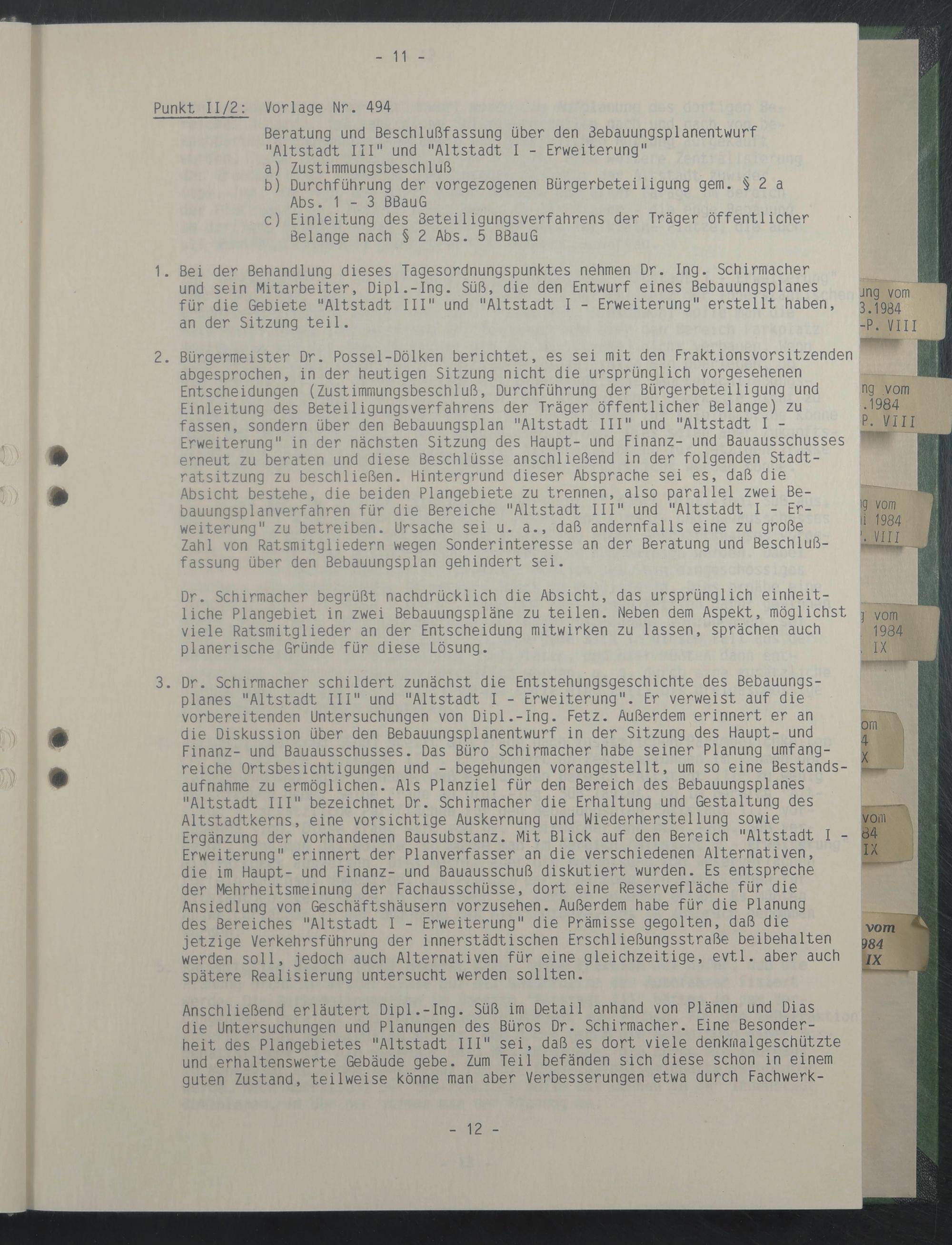 1. Bei der Behandlung dieses Tagesordnungspunktes nehmen Dr. Ing. Schirmacher und sein Mitarbeiter, Dipl.-Ing. Süß, die den Entwurf eines Bebauungsplanes für die Gebiete "Altstadt III" und "Altstadt I - Erweiterung" erstellt haben, an der Sitzung teil.