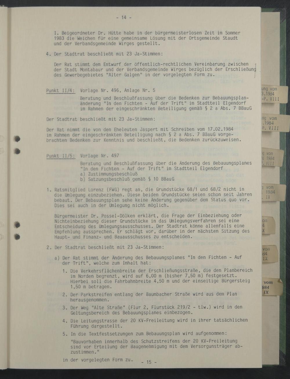 Der Rat nimmt die von den Eheleuten Jaspert mit Schreiben vom 17.02.1984 im Rahmen der eingeschränkten Beteiligung nach § 2 a Abs. 7 BBauG vorge- brachten Bedenken zur Kenntnis und beschließt, die Bedenken zurückzuweisen.