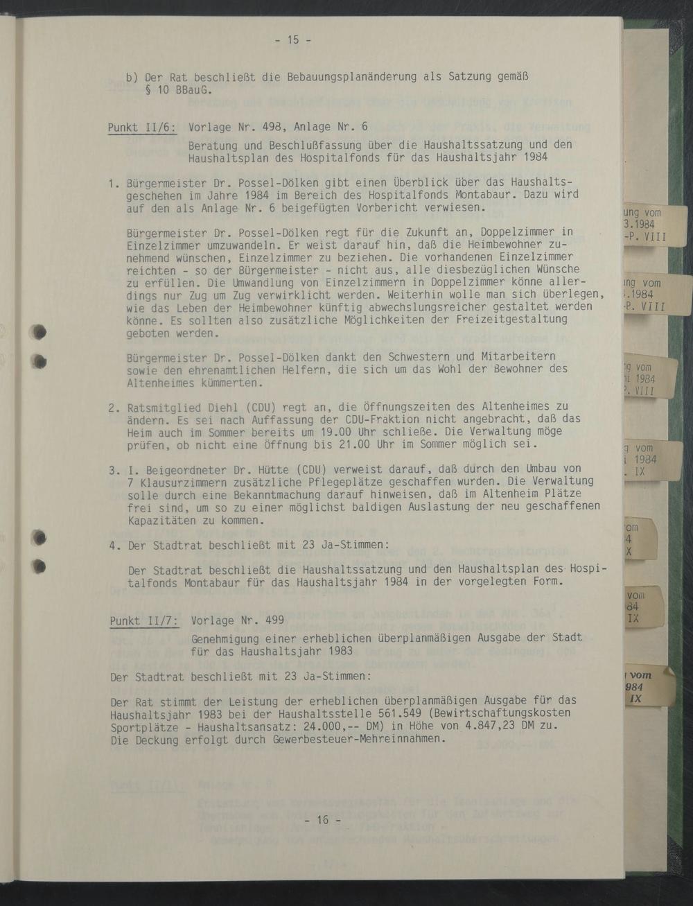 Der Stadtrat beschließt die Haushaltssatzung und den Haushaltsplan des Hospitalfonds Montabaur für das Haushaltsjahr 1984 in der vorgelegten Form.