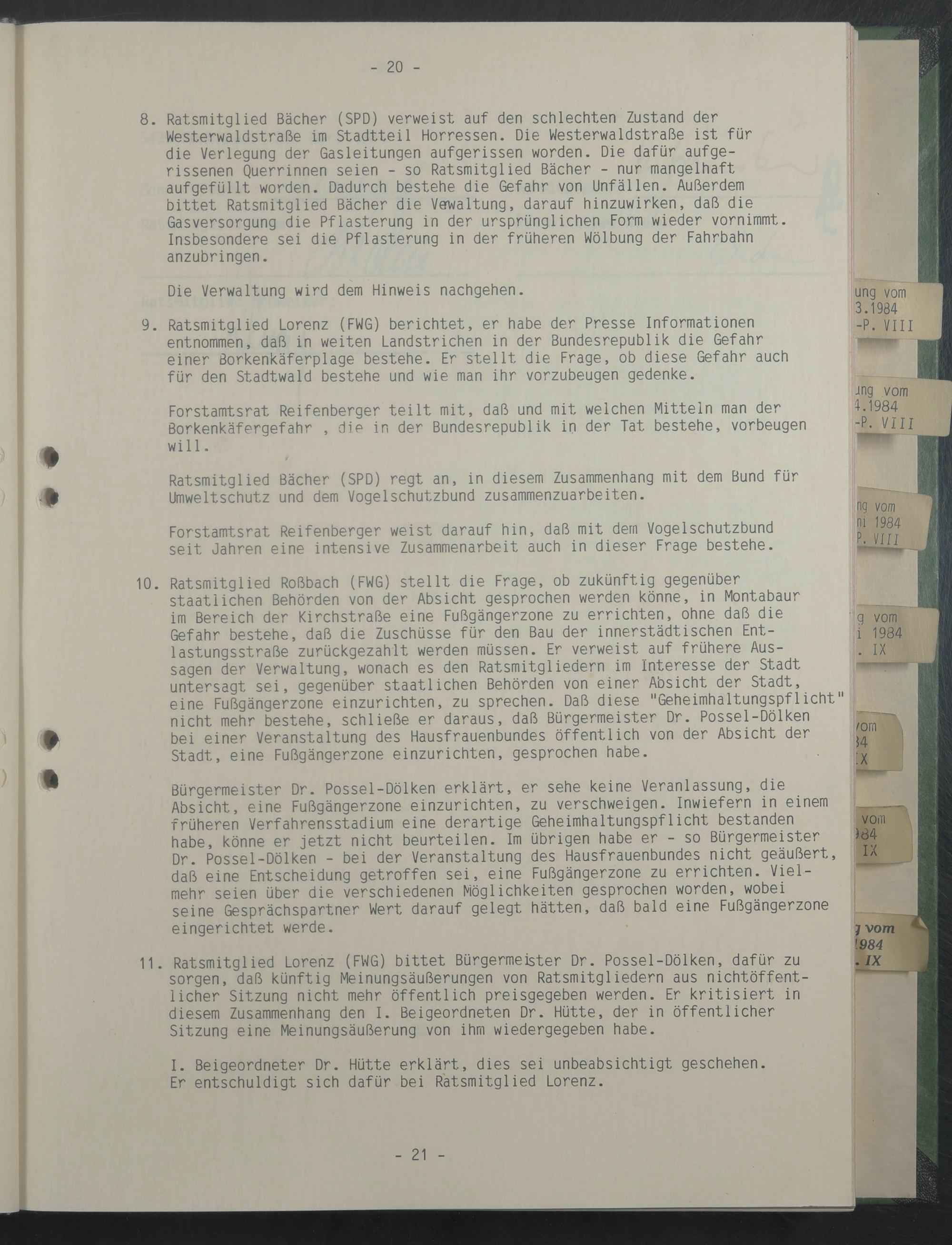11. Ratsmitglied Lorenz (FWG) bittet Bürgermeister Dr. Possel-Dölken, dafür zu sorgen, daß künftig Meinungsäußerungen von Ratsmitgliedern aus nichtöffentlicher Sitzung nicht mehr öffentlich preisgegeben werden. Er kritisiert in diesem Zusammenhang den I. Beigeordneten Dr. Hütte, der in öffentlicher Sitzung eine Meinungsäußerung von ihm wiedergegeben habe.