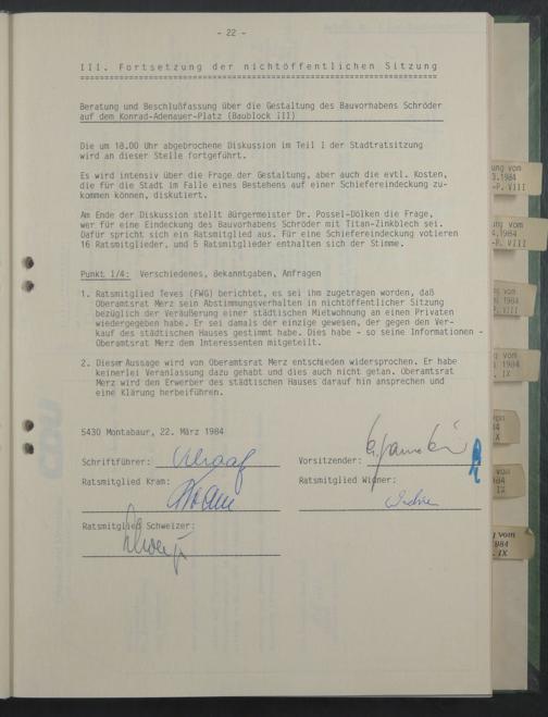 Am Ende der Diskussion stellt Bürgermeister Dr. Possel-Dölken die Frage, wer für eine Eindeckung des Bauvorhabens Schröder mit Titan-Zinkblech sei. Dafür spricht sich ein Ratsmitglied aus. Für eine Schiefereindeckung votieren 16 Ratsmitglieder, und 5 Ratsmitglieder enthalten sich der Stimme.