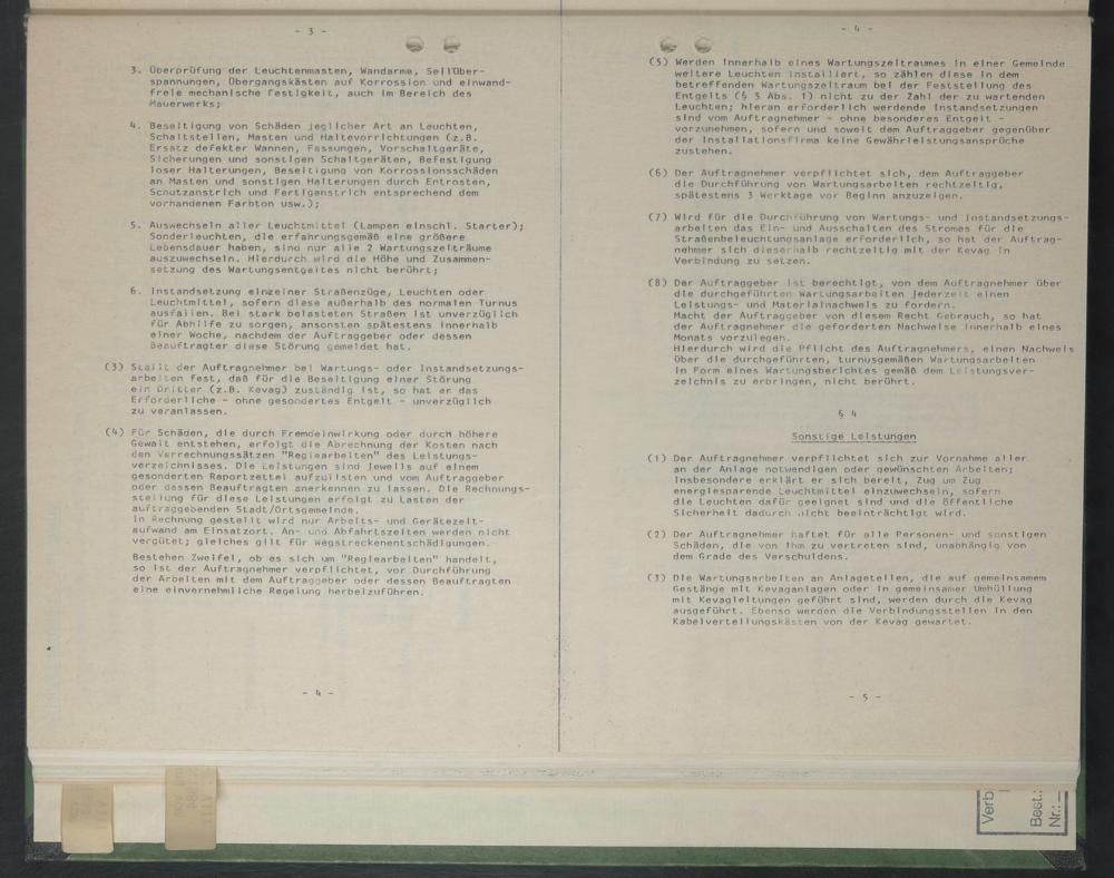 (7) Wird für die Durchführung von Wartungs- und Instandsetzungsarbeiten das Ein- und Ausschalten des Stromes für die Straßenbeleuchtungsanlage erforderlich, so hat der Auftragnehmer sich dieserhaib rechtzeitig mit der Kevag in Verbindung zu setzen.