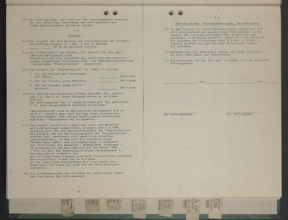 (5) Das Entgelt wird alle 2 Jahre den Lohn- und Materlal- prelsstelgerungen angegllchen; erstmals zum 1.1.1986. Dasselbe gilt für dte Verrechnungssätze der "Regiearbeiten". Das Entgelt und die Verrechnungssätze der "Regiearbeiten" erhöhen oder vermindern sich Jeweils um denselben vom-HundertsatZ; ln dem sich die Unterpositionen "elektrische Kabel- und Leltungsanlagen ln Gebäuden"