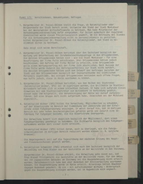 Die meisten Ortsgemeinden hätten auch dem Entwurf des Vertrages zwischen der Stadt und den Ortsgemeinden bezüglich der Inanspruchnahme des städtischen Personals zugestimmt. Bei einigen Ortsgemeinden bestünden noch offene Fragen, man hoffe jedoch, diese in Kürze ausräumen zu können.