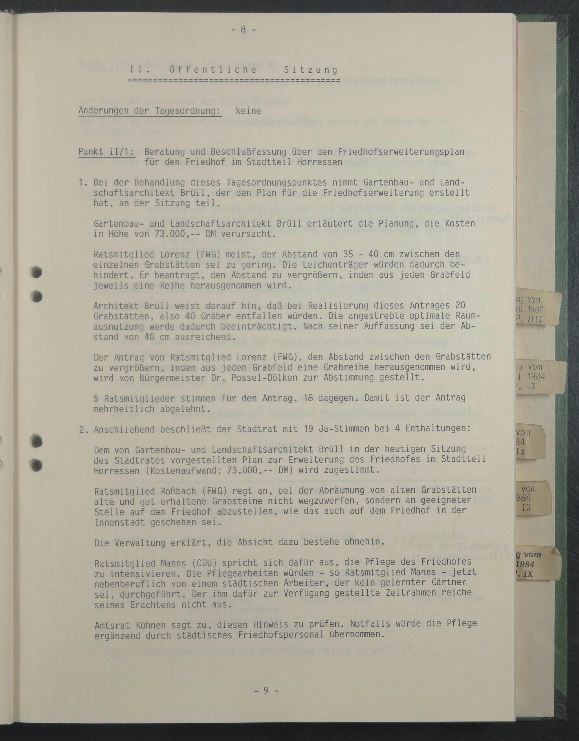 Dem von Gartenbau- und Landschaftsarchitekt Brüll in der heutigen Sitzung des Stadtrates vorgestellten Plan zur Erweiterung des Friedhofes im Stadtteil Horressen (Kostenaufwand: 73.000,-- DM) wird zugestimmt.