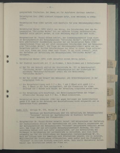 Ratsmitglied Helga Schneider (CDU) hat wegen Voriiegen von Sonderinteresse gemäß § 22 GemO an der Beratung und Beschlußfassung nicht mitgewirkt und im Zuhörerraum Platz genommen.