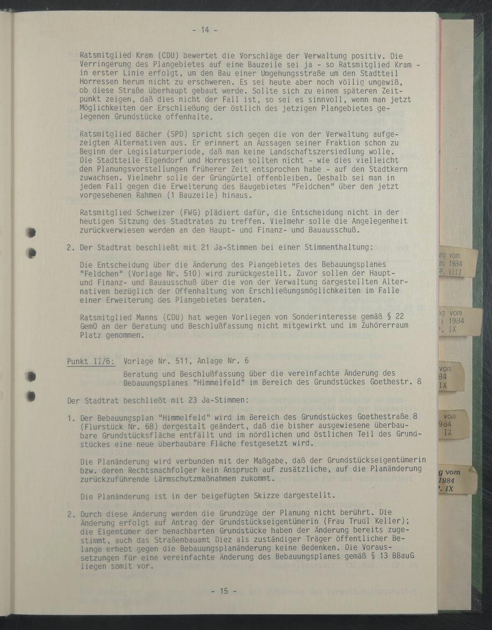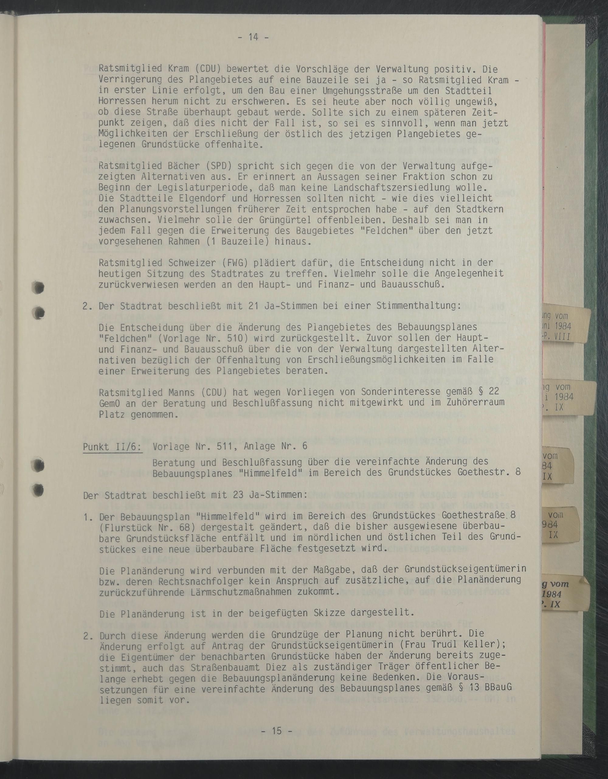 Die Stadtteile Eigendorf und Horressen sollten nicht - wie dies vielleicht den Planungsvorstellungen früherer Zeit entsprochen habe - auf den Stadtkern Zuwachsen. Vielmehr solle der Grüngürtel offenbleiben. Deshalb sei man in jedem Fall gegen die Erweiterung des Baugebietes "Feldchen" über den jetzt vorgesehenen Rahmen (1 Bauzeile) hinaus.