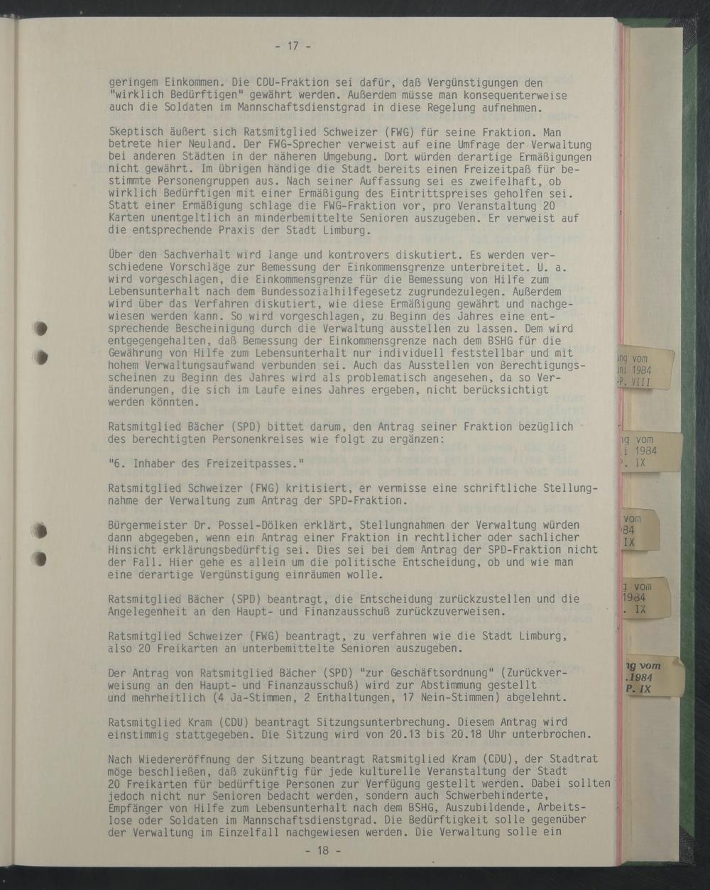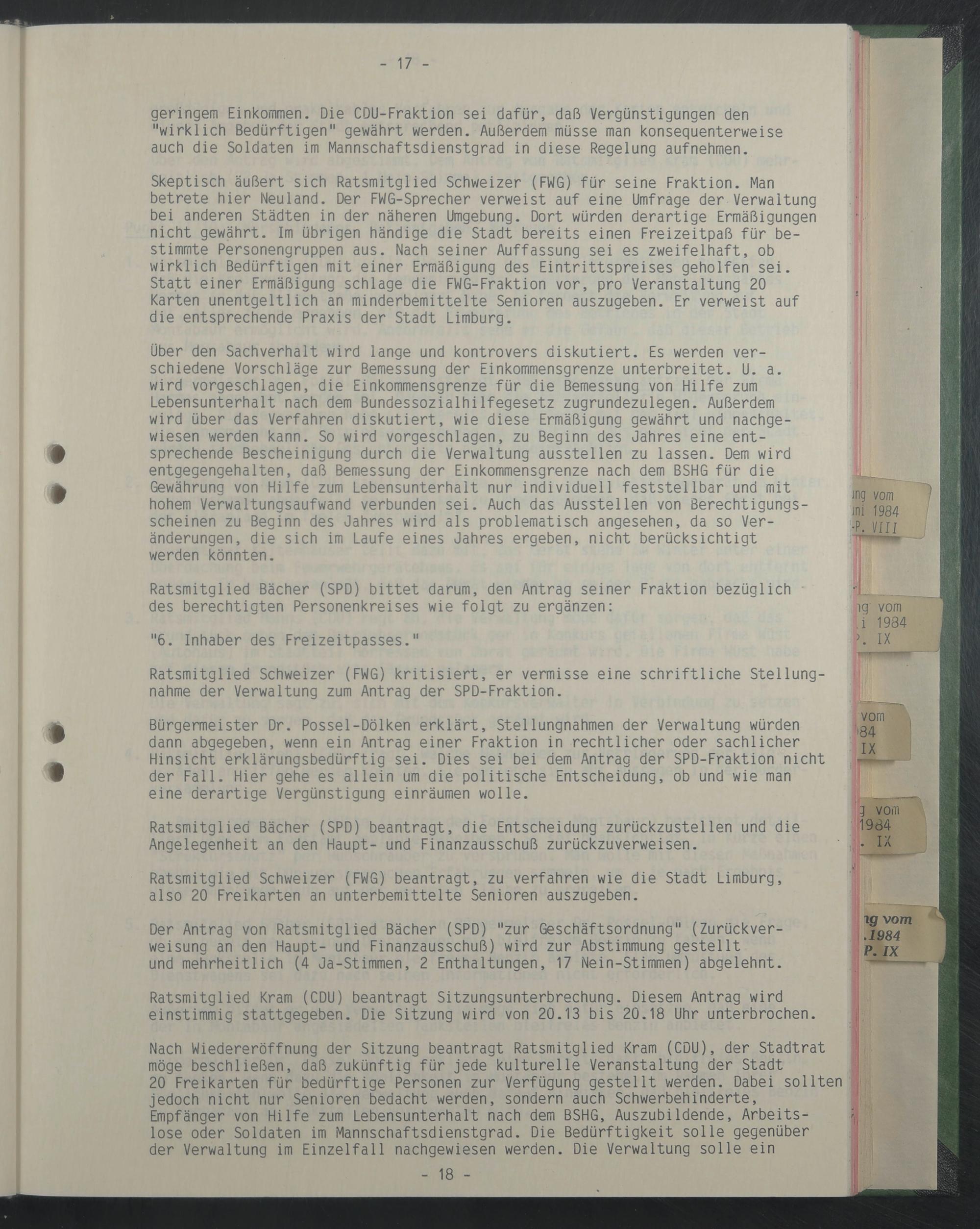 Ratsmitglied Schweizer (FWG) beantragt, zu verfahren wie die Stadt Limburg, also 20 Freikarten an unterbemittelte Senioren auszugeben.