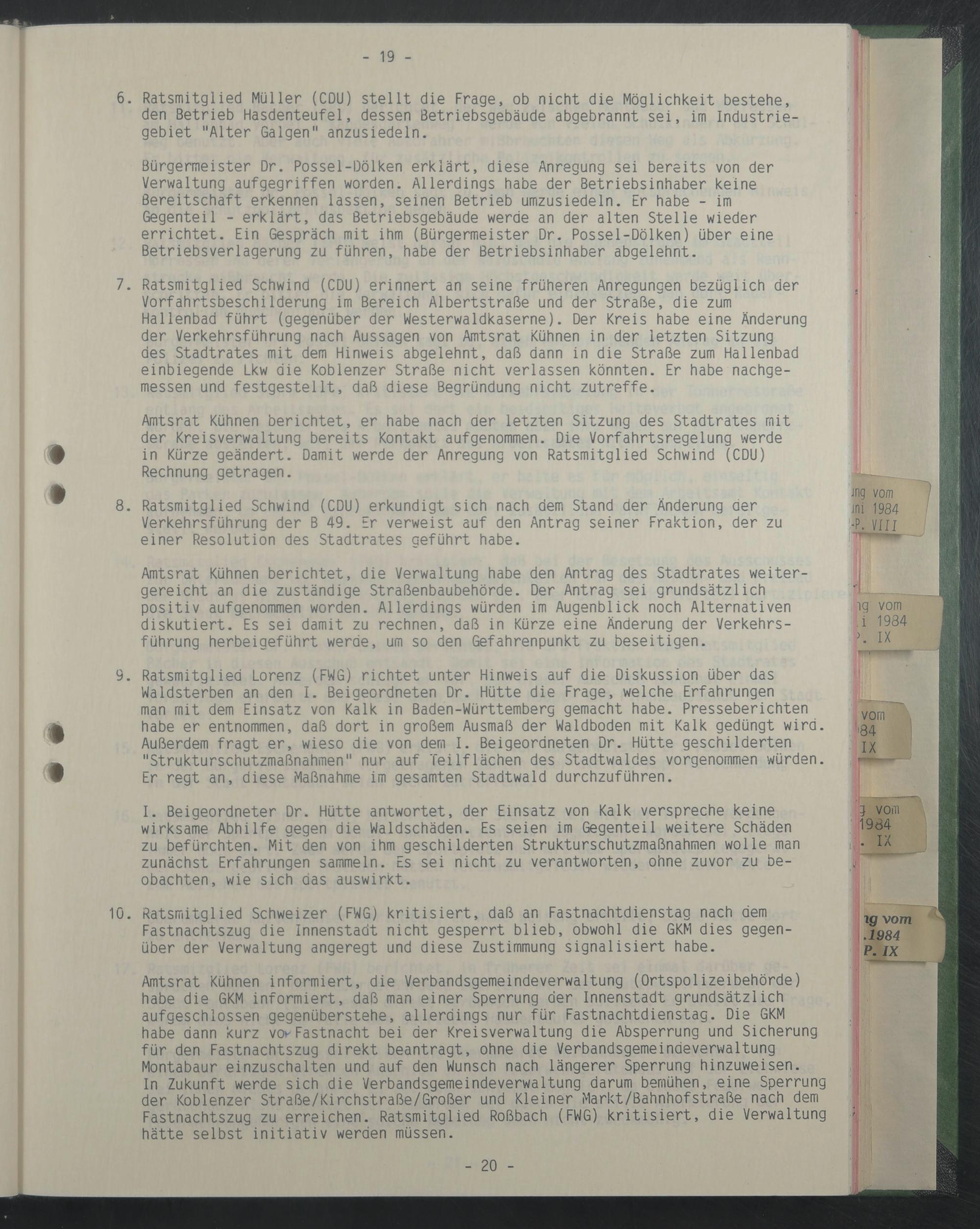 10. Ratsmitglied Schweizer (FWG) kritisiert, daß an Fastnachtdienstag nach dem Fastnachtszug die Innenstadt nicht gesperrt blieb, obwohl die GKM dies gegenüber der Verwaltung angeregt und diese Zustimmung signalisiert habe.