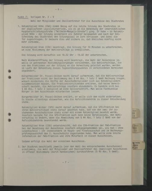 Ratsmitglied Kram (CDU) unterstreicht, daß die CDU-Fraktion der FWG-Fraktion bei der Besetzung der Ausschüsse insofern entgegengekommen sei, als man - ohne Losentscheid - ihr insbesondere im Haupt- und Finanzausschuß und im Rechnungsprüfungsausschuß den 2. Ausschußsitz zugestanden habe. Man wolle eine breite Information der FWG-Fraktion und ihre Mitarbeit in diesen Ausschüssen.