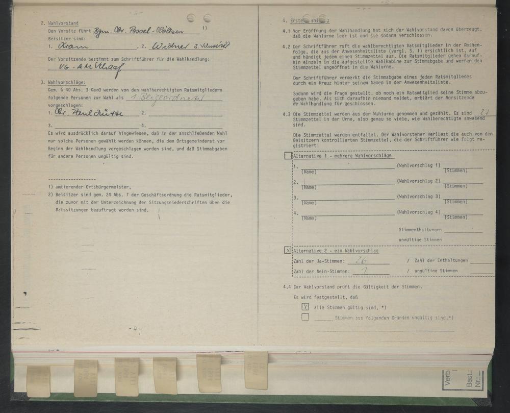 Sodann wird die Frage gestellt, ob noch ein Ratsmitglied seine Stimme abzugeben habe. Als sich daraufhin niemand meldet, erklärt der Vorsitzende Wahlhandlung für geschlossen.