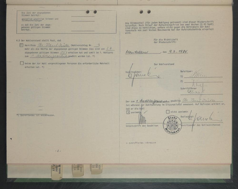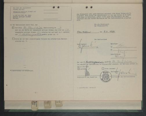 Die Stimmzettel (für jeden Wahlgang getrennt) sind dieser Niederschrift beigefügt. Nach Ablauf der Anfechtungsfrist von zwei Wochen (§ 43 GemO) sind diese zu vernichten, sofern nicht gegen die Gültigkeit der Wahl innerhalb von zwei Wochen Beschwerde bei der Aufsichtsbehörde eingelegt wird.