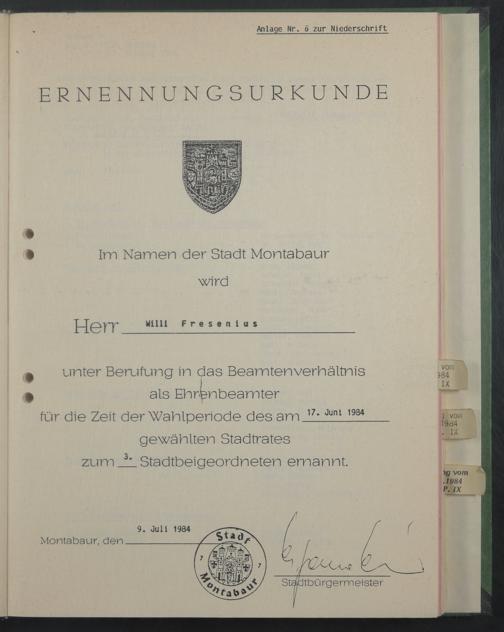 gewählten Stadtrates zum 3* Stadtbeigeordneten ernannt.