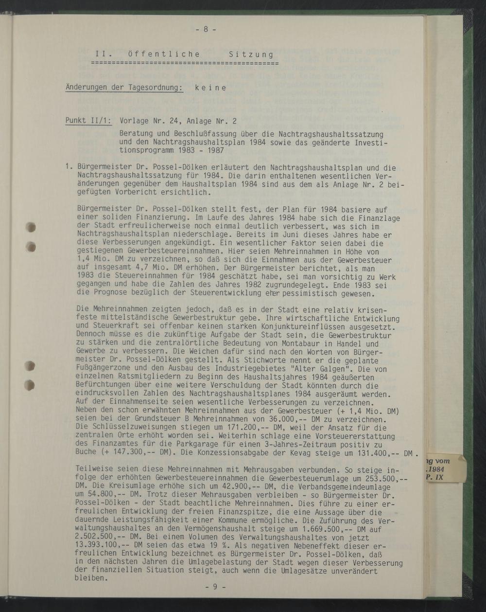 1. Bürgermeister Dr. Possel-Dölken erläutert den Nachtragshaushaltsplan und die Nachtragshaushaltssatzung für 1984. Die darin enthaltenen wesentlichen Veränderungen gegenüber dem Haushaltsplan 1984 sind aus dem als Anlage Nr. 2 bei- gefügten Vorbericht ersichtlich.
