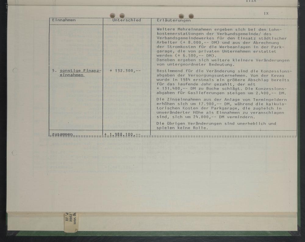 Die Zinseinnahmen aus der Anlage von Termingeldern erhöhen sich um 17.900,— DM, während die kalkulatorischen Kosten der Parkgarage, die zugleich In unveränderter Höhe als Einnahmen zu veranschlagen sind, sich um 24.000,-- DM vermindern.