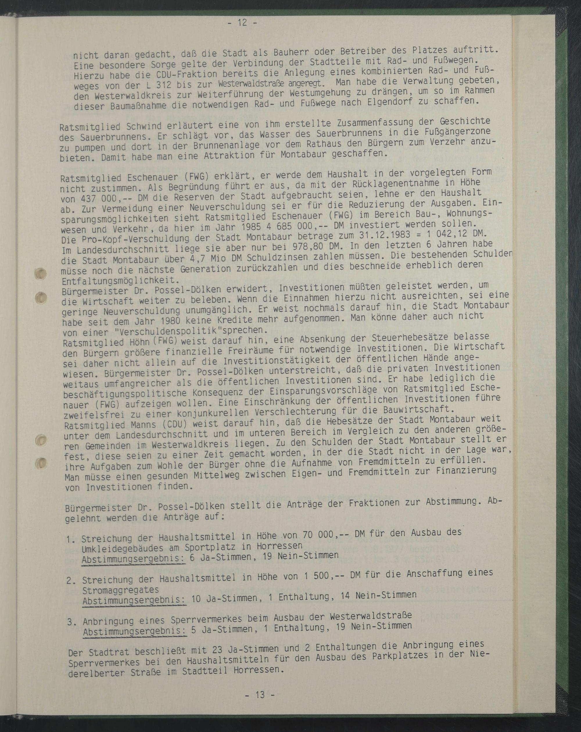 Ratsmitglied Eschenauer (FWG) erklärt, er werde dem Haushalt in der vorgelegten Form nicht zustimmen. Als Begründung führt er aus, da mit der Rücklagenentnahme in Höhe von 437 000,-- DM die Reserven der Stadt aufgebraucht seien, lehne er den Haushalt ab. Zur Vermeidung einer Neuverschuldung sei er für die Reduzierung der Ausgaben. Einsparungsmöglichkeiten sieht Ratsmitglied Eschenauer (FWG) im Bereich Bau-, Wohnungswesen und Verkehr, da hier im Jahr 1985 4 685 000,— DM investiert werden sollen.