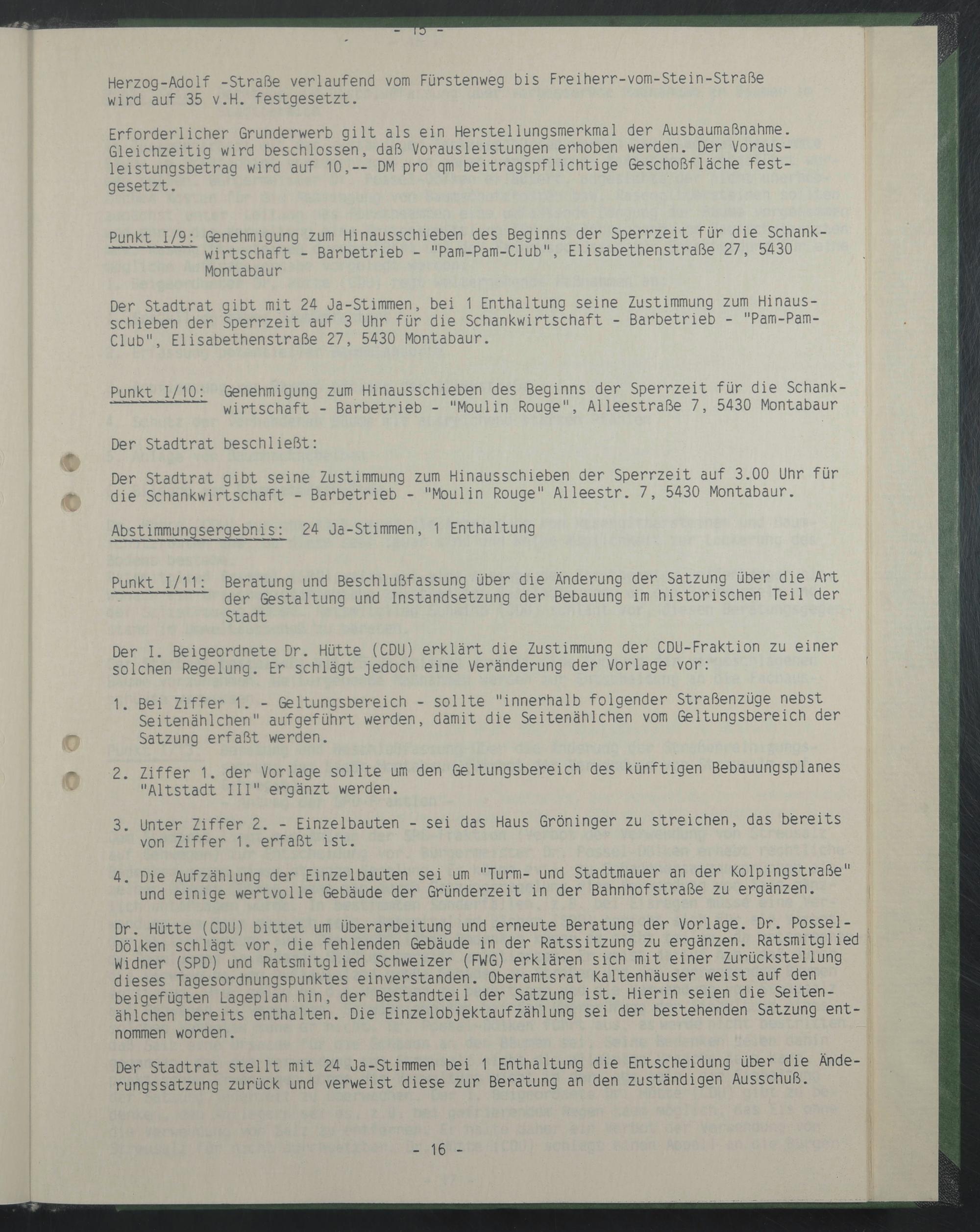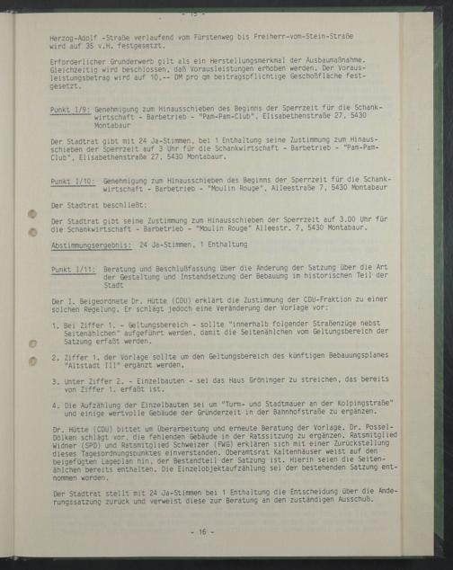Der Stadtrat gibt mit 24 Ja-Stimmen, bei 1 Enthaltung seine Zustimmung zum Hinausschieben der Sperrzeit auf 3 Uhr für die Schankwirtschaft - Barbetrieb - "Pam-Pam- Club", Elisabethenstraße 27, 5430 Montabaur.