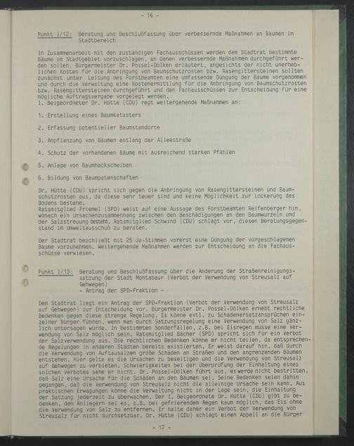 Dem Stadtrat liegt ein Antrag der SPD-Fraktion (Verbot der Verwendung von Streusalz auf Gehwegen) zur Entscheidung vor. Bürgermeister Dr. Possel-Dölken erhebt rechtliche Bedenken gegen diese strenge Regelung. Es könne evtl, zu Schadenersatzansprüchen einzelner Bürger führen, wenn man durch Satzungsregelung eine Verwendung von Salz gänzlich untersagen würde. In bestimmten Sonderfällen, z.B. bei Eisregen müsse eine Verwendung von Salz möglich sein. Ratsmitglied Bächer (SPD) spricht sich für ein Verbot der Salzverwendung aus. Die rechtlichen Bedenken könne er nicht teilen, da entsprechende Regelungen in anderen Städten bereits existierten. Er weist darauf hin, daß durch die Verwendung von Auftausalzen große Schäden an Straßen und den angrenzenden Bäumen entstehen. Hier gelte es die Ursachen zu beseitigen und die Verwendung von Streusalz auf Gehwegen zu verbieten. Schwierigkeiten bei der Überprüfung der Einhaltung eines solchen Verbotes sehe er nicht. Dr. Possel-Dölken führt aus, es werde nicht bestritten, daß Salz eine Ursache für die Schäden an den Bäumen sei. Seine Bedenken seien dahin gegangen, daß die Verwendung von Streusalz nicht die alleinige Ursache sein kann. Aus praktischen Erwägungen könne die Verwaltung nicht in der Lage sein, die Einhaltung der Satzung jederzeit zu überwachen. Der I. Beigeordnete Dr. Hütte (CDU) gibt zu bedenken, den Anliegern sei es, z.B. bei gefrierendem Regen kaum möglich, das Eis ohne die Verwendung von Salz zu entfernen. Er halte daher ein Verbot der Verwendung von Streusalz für nicht durchsetzbar. Dr. Hütte (CDU) schlägt einen Appell an die Bürger