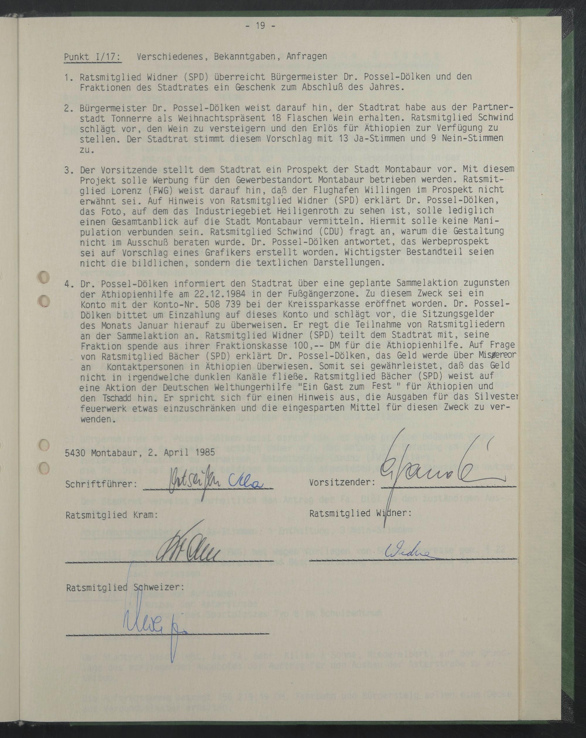 2. Bürgermeister Dr. Possel-Dölken weist darauf hin, der Stadtrat habe aus der Partnerstadt Tonnerre als Weihnachtspräsent 18 Flaschen Wein erhalten. Ratsmitglied Schwind schlägt vor, den Wein zu versteigern und den Erlös für Äthiopien zur Verfügung zu stellen. Der Stadtrat stimmt diesem Vorschlag mit 13 Ja-Stimmen und 9 Nein-Stimmen zu.