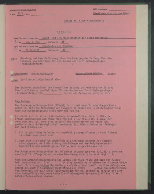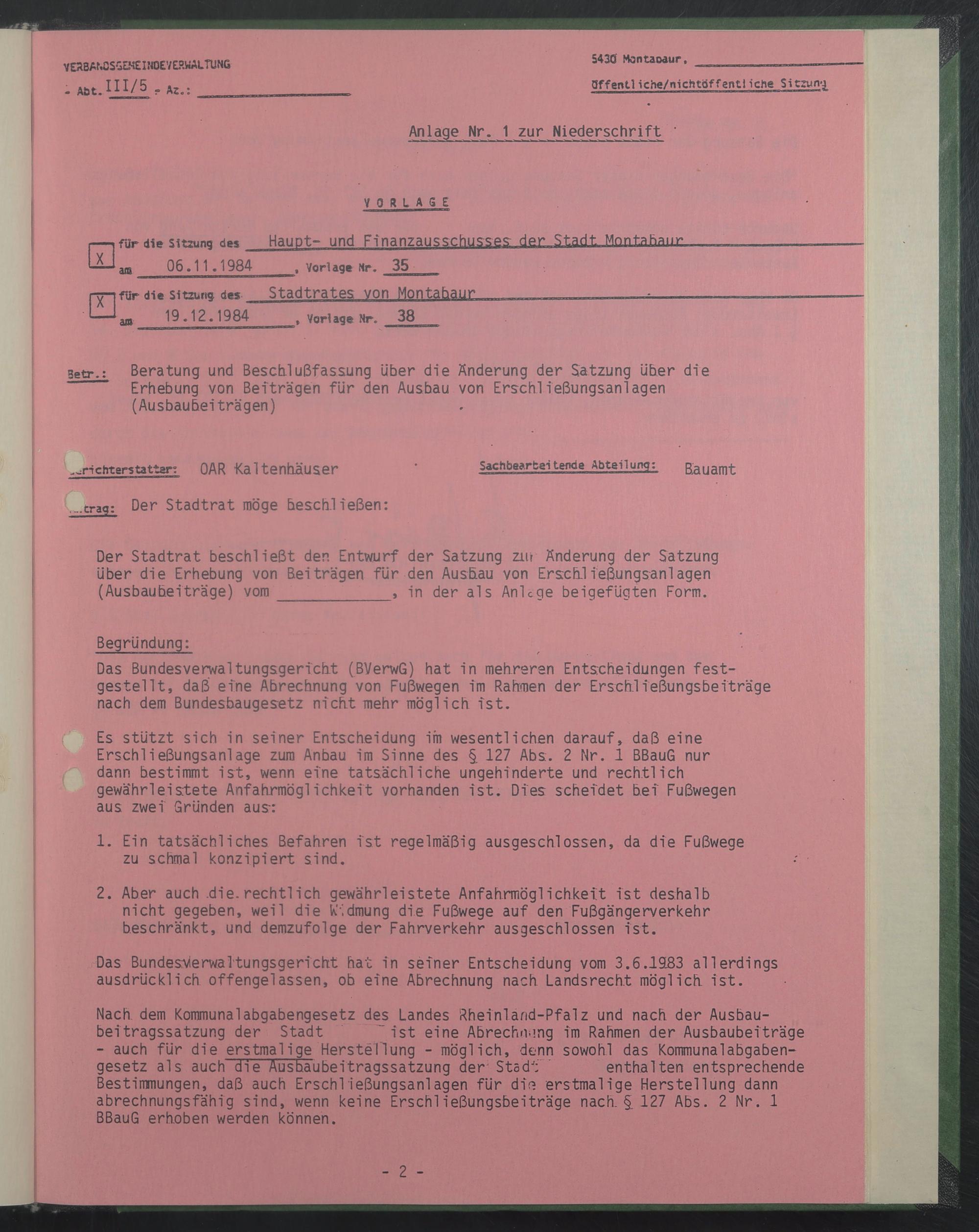 für die Sitzung des Haupt- und Finanzausschüsse? der S tadt Montabaur ans 06.11.1984 , Vorlage Mr. 35