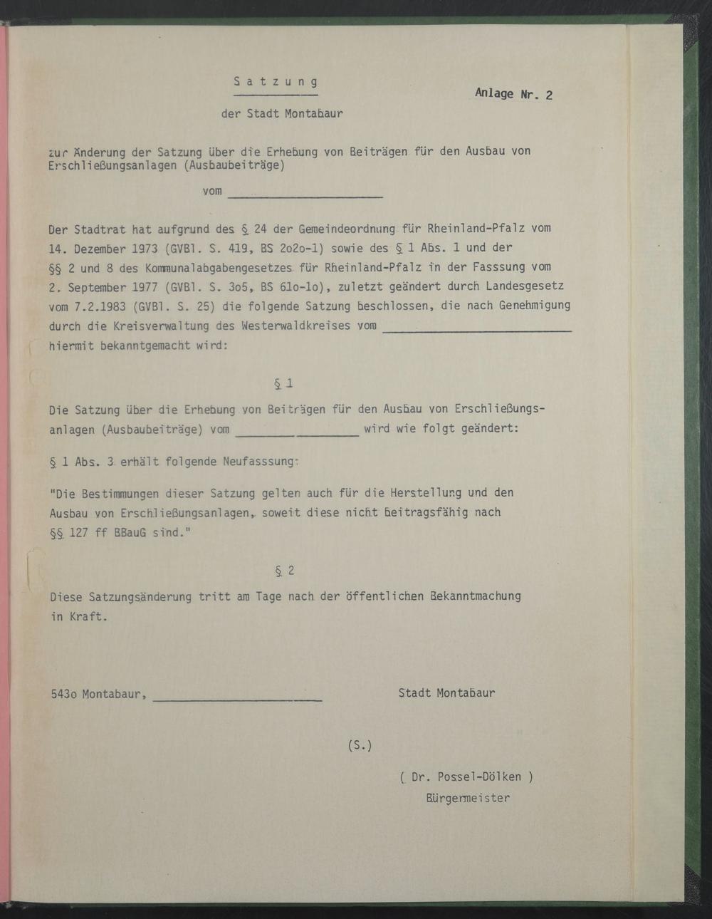 Der Stadtrat hat aufgrund des §, 24 der Gemeindeordnung für Rheinland-Pfalz vom 14. Dezember 1973 (GVB1. S. 419, BS 2o2o-l) sowie des § 1 Abs. 1 und der §§ 2 und 8 des Kommunalabgabengesetzes für Rheinland-Pfalz in der Fasssung vom 2. September 1977 (GVB1. S. 3o5, BS 61o-lo), zuletzt geändert durch Landesgesetz vom 7.2.1983 (GVB1. S. 25) die folgende Satzung beschlossen, die nach Genehmigung