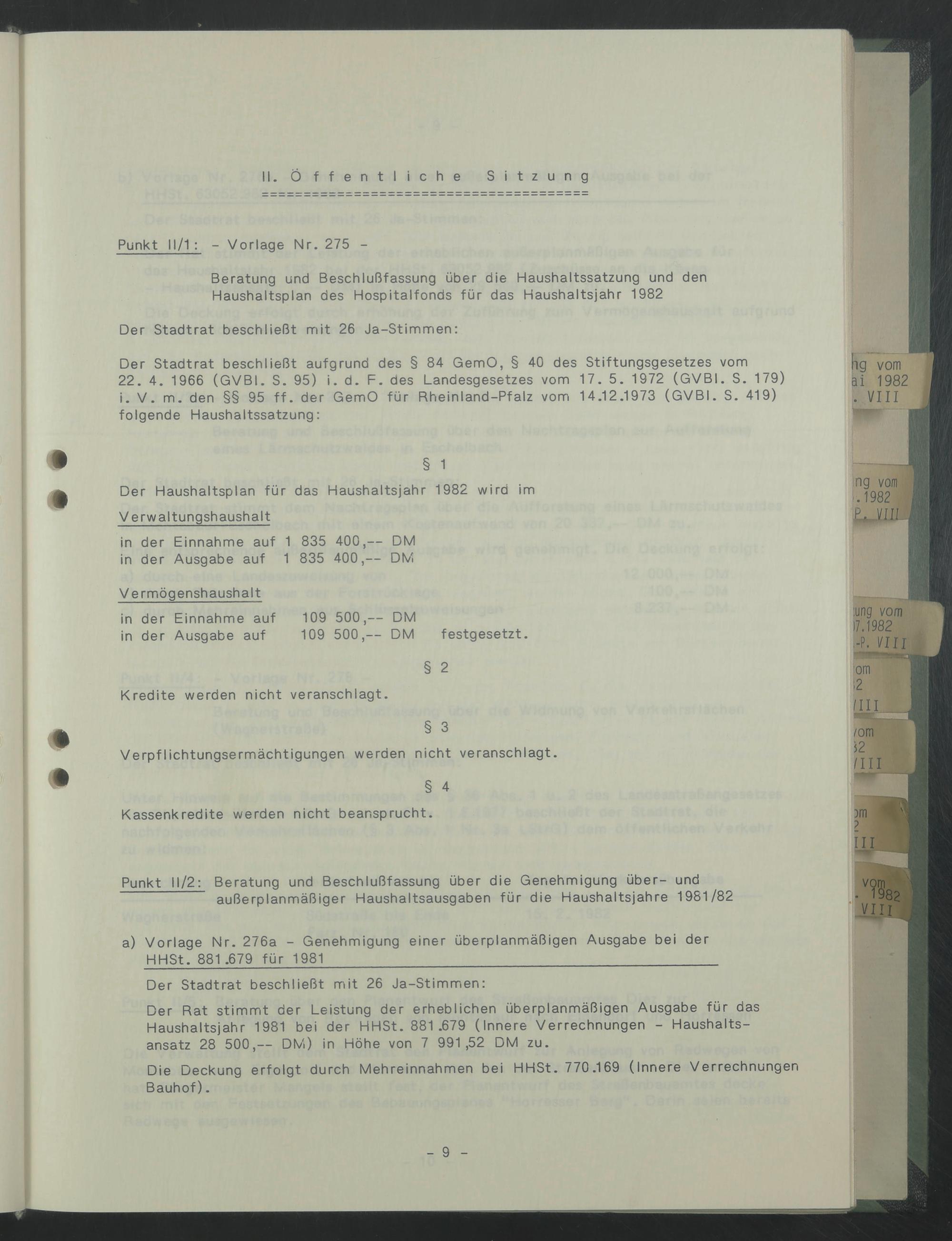 Beratung und Beschlußfassung über die Haushattssatzung und den Haushattsptan des Hospitatfonds für das Haushaitsjahr 1982