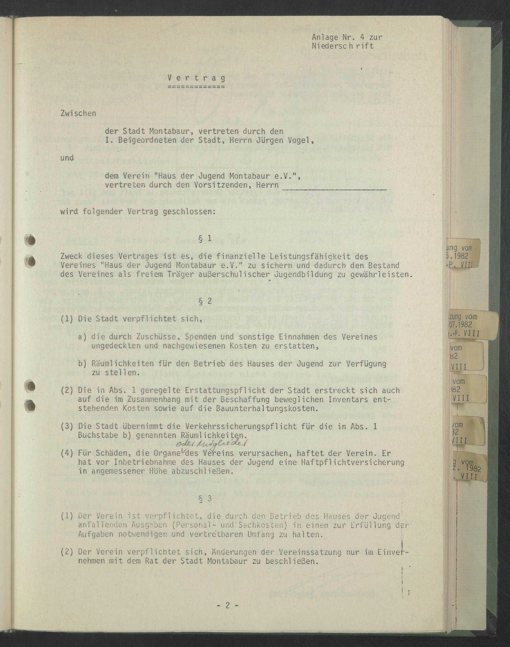 Zweck dieses Vertrages ist es, die finanzielle Leistungsfähigkeit des Vereines "Haus der Jugend Montabaur e.V." zu sichern und dadurch den Bestand des Vereines als freiem Träger außerschulischer Jugendbildung zu gewährleisten.
