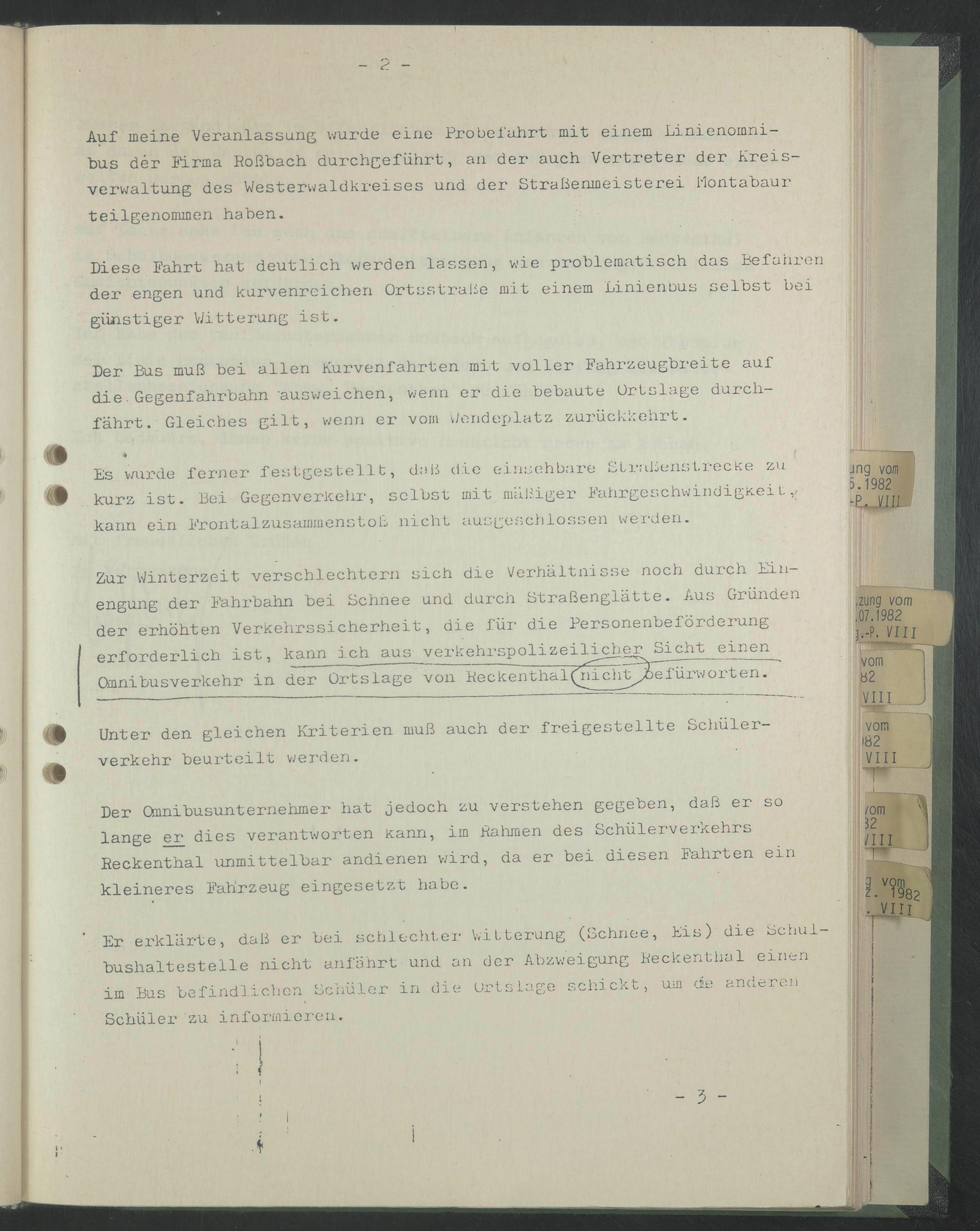 Zur Winterzeit verschlechtern sich die Verhältnisse noch durch Einengung der Fahrbahn bei Schnee und durch Straßenglätte. Aus Gründen der erhöhten Verkehrssicherheit, die für die Personenbeförderung erforderlich ist, kann ich aus verkehrspolizeilicher Sicht einen Omnibusverkehr in der Ortslage von Reckenthal( nich^ ^Jfürw orten.