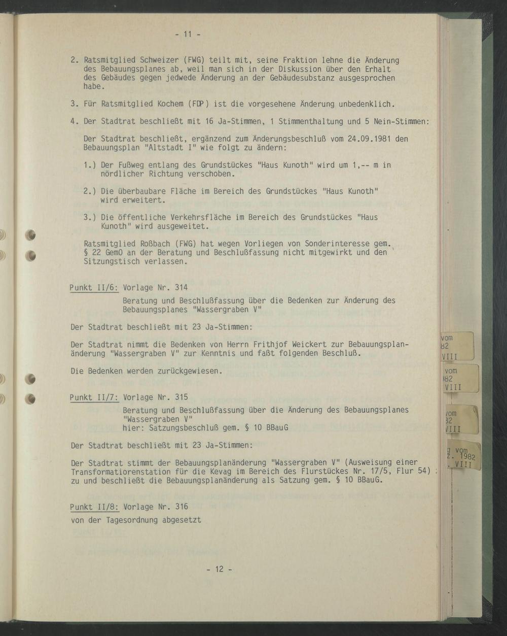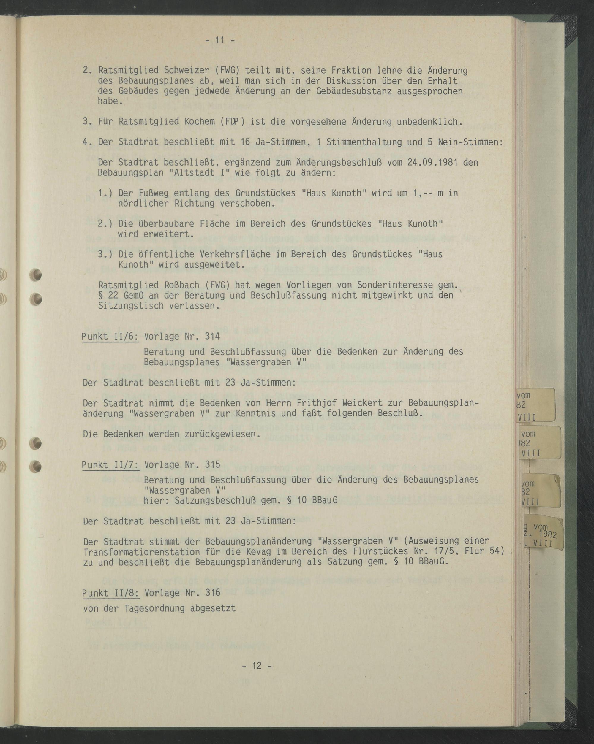 Der Stadtrat stimmt der Bebauungsplanänderung "Wassergraben V" (Ausweisung einer Transformatiorenstation für die Kevag im Bereich des Flurstückes Nr. 17/5, Flur 54) : zu und beschließt die Bebauungsplanänderung als Satzung gern. § 10 BBauG.