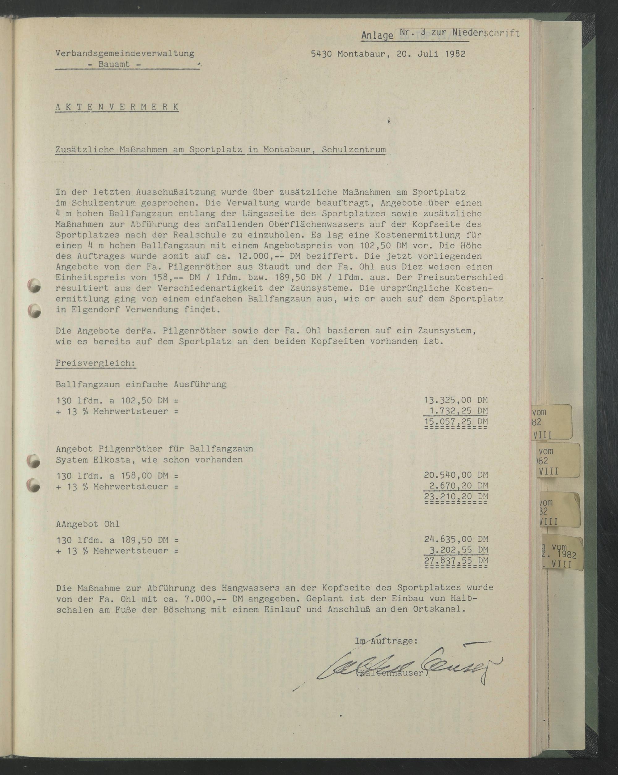 In der letzten Ausschußsitzung wurde über zusätzliche Maßnahmen am Sportplatz im Schulzentrum gesprochen. Die Verwaltung wurde beauftragt, Angebote.über einen 4 m hohen Ballfangzaun entlang der Längsseite des Sportplatzes sowie zusätzliche Maßnahmen zur Abführung des anfallenden Oberflächenwassers auf der Kopfseite des Sportplatzes nach der Realschule zu einzuholen. Es lag eine Kostenermittlung für einen 4 m hohen Ballfangzaun mit einem Angebotspreis von 102,50 DM vor. Die Höhe des Auftrages wurde somit auf ca. 12.000,— DM beziffert. Die jetzt vorliegenden Angebote von der Fa. Pilgenröther aus Staudt und der Fa. Ohl aus Diez weisen einen Einheitspreis von 158,— DM / lfdm. bzw. 189,50 DM / lfdm. aus. Der Preisunterschied resultiert aus der Verschiedenartigkeit der Zaunsysteme. Die ursprüngliche Kostenermittlung ging von einem einfachen Ballfangzaun aus, wie er auch auf dem Sportplatz in Eigendorf Verwendung findet.