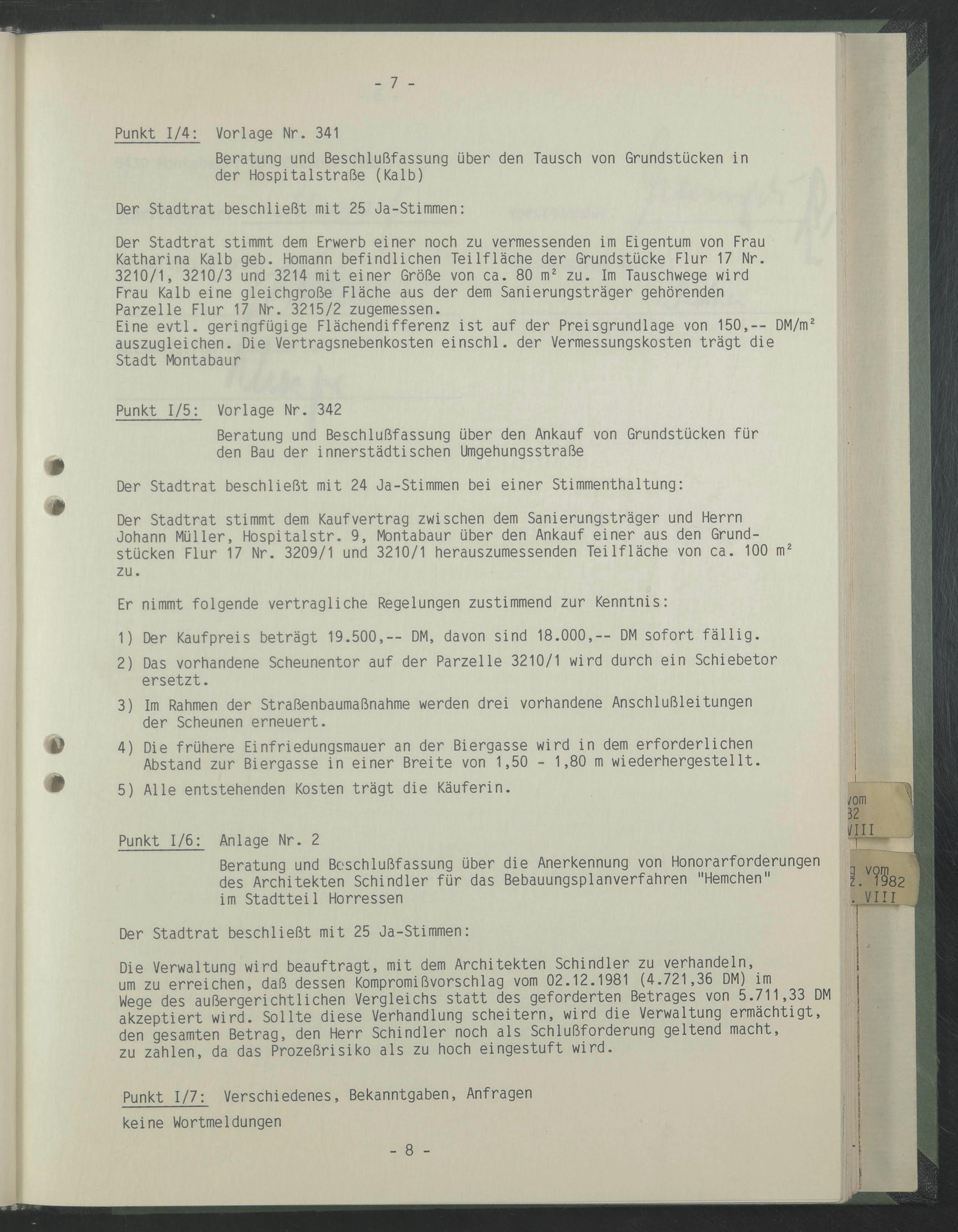 Der Stadtrat stimmt dem Kaufvertrag zwischen dem Sanierungsträger und Herrn Johann Müller, Hospitalstr. 9, Montabaur über den Ankauf einer aus den Grundstücken Flur 17 Nr. 3209/1 und 3210/1 herauszumessenden Teilfläche von ca. 100 m' zu.