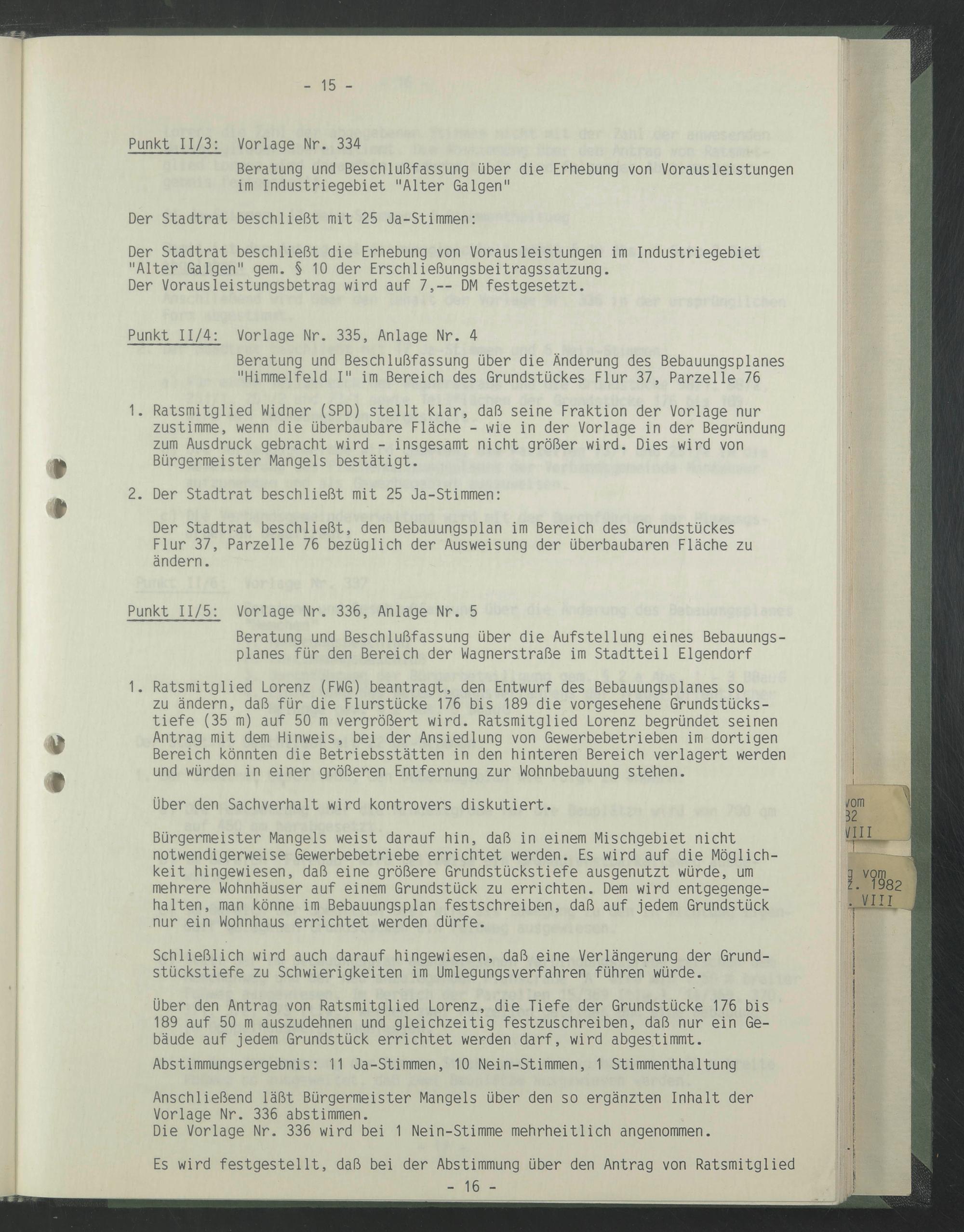 Über den Antrag von Ratsmitglied Lorenz, die Tiefe der Grundstücke 176 bis 189 auf 50 m auszudehnen und gleichzeitig festzuschreiben, daß nur ein Gebäude auf jedem Grundstück errichtet werden darf, wird abgestimmt.