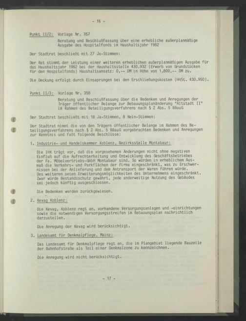 Die IHK trägt vor, daß die vorgesehenen Änderungen nicht ohne negativen Einfluß auf die Aufrechterhaltung und Entwicklung des Geschäftsbetriebes der Fa. Möbelvertriebs-GmbH Montabaur sind. So würden in erheblichem Ausmaß die Verkehrs- und Parkflächen der Firma eingeschränkt, was zu Erschwernissen bei der Anlieferung und dem Antransport der Waren führen würde.